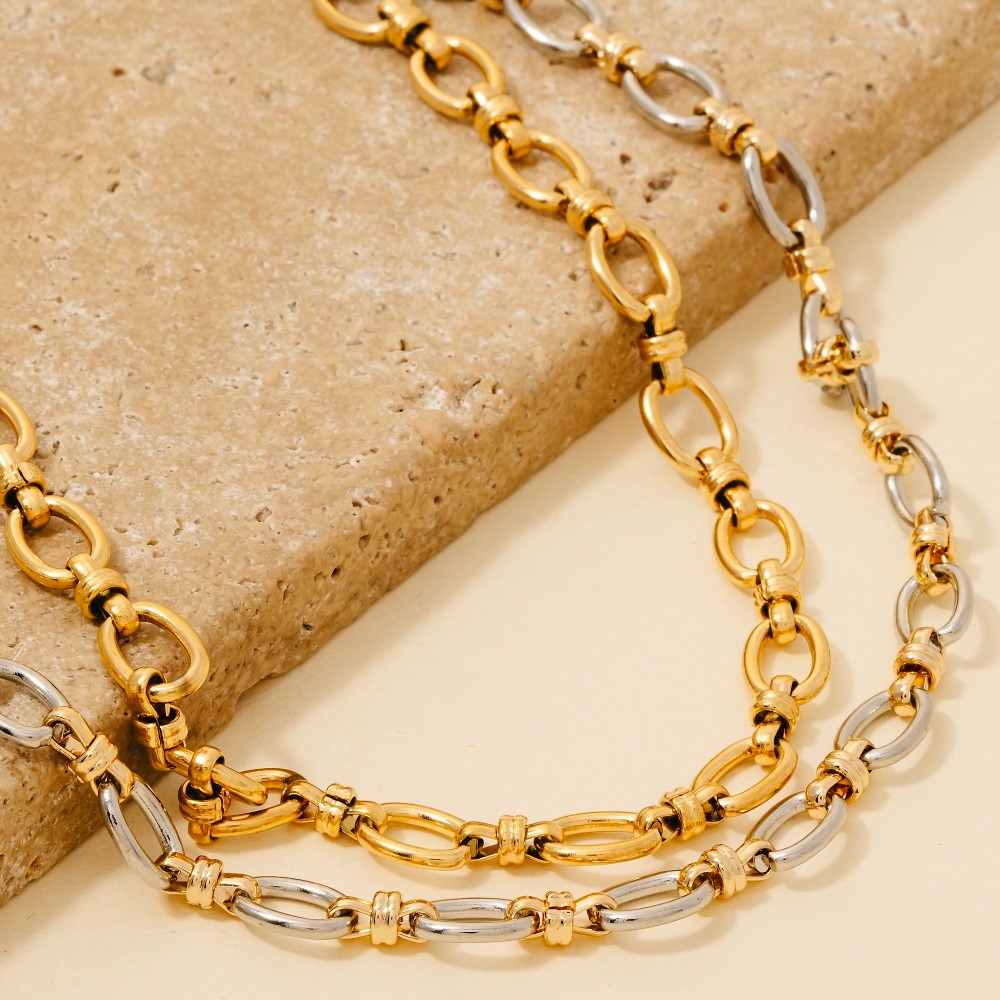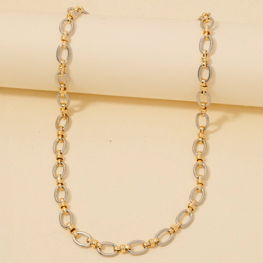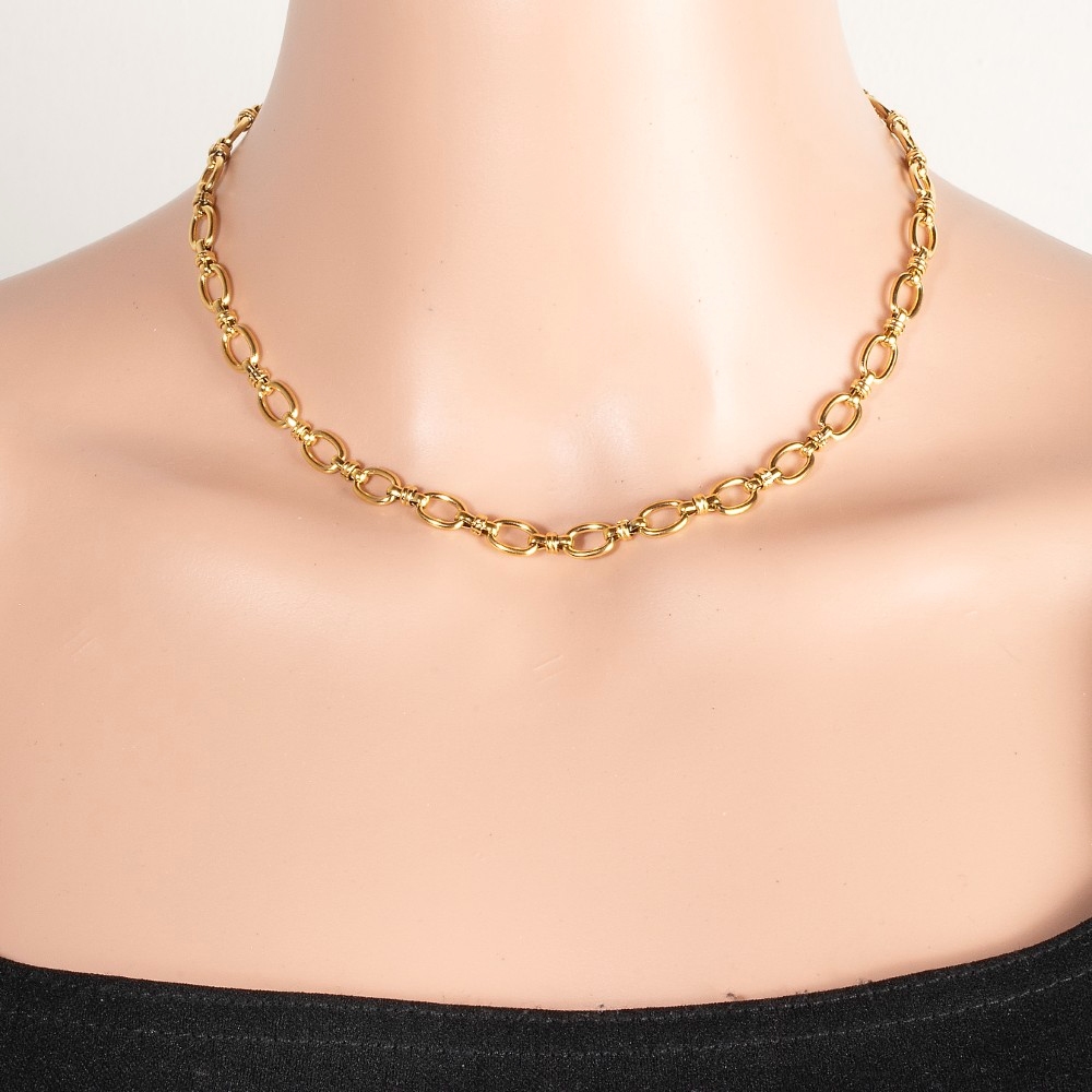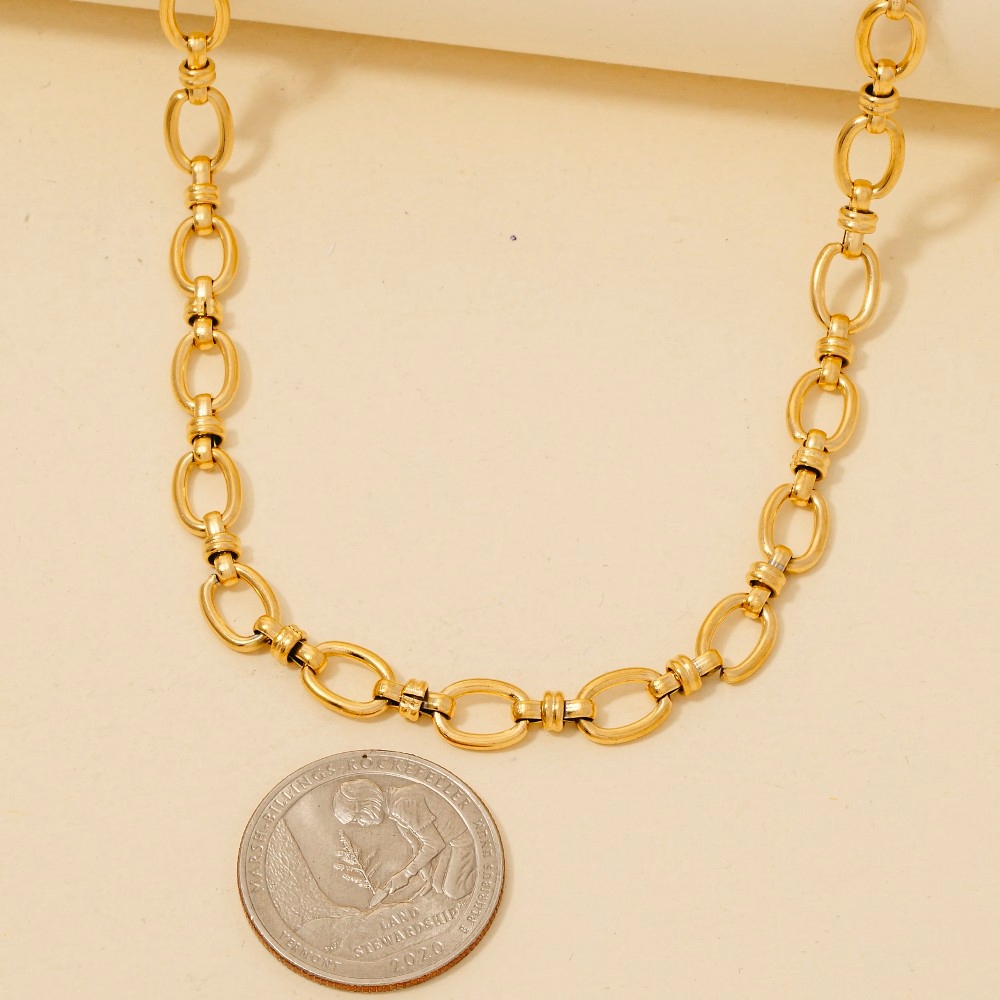 • Unleash your inner fashionista, this necklace features a distinct intricate oval chain link design. Redefine your fashion identity with this versatile necklace, a timeless piece that complements any wardrobe. Available in G, K. This item is sold in packs of 1.