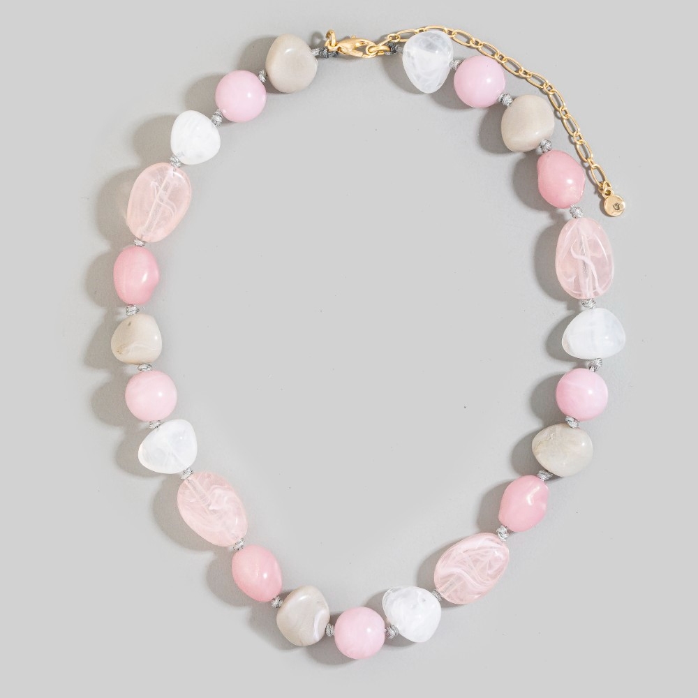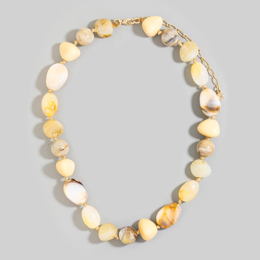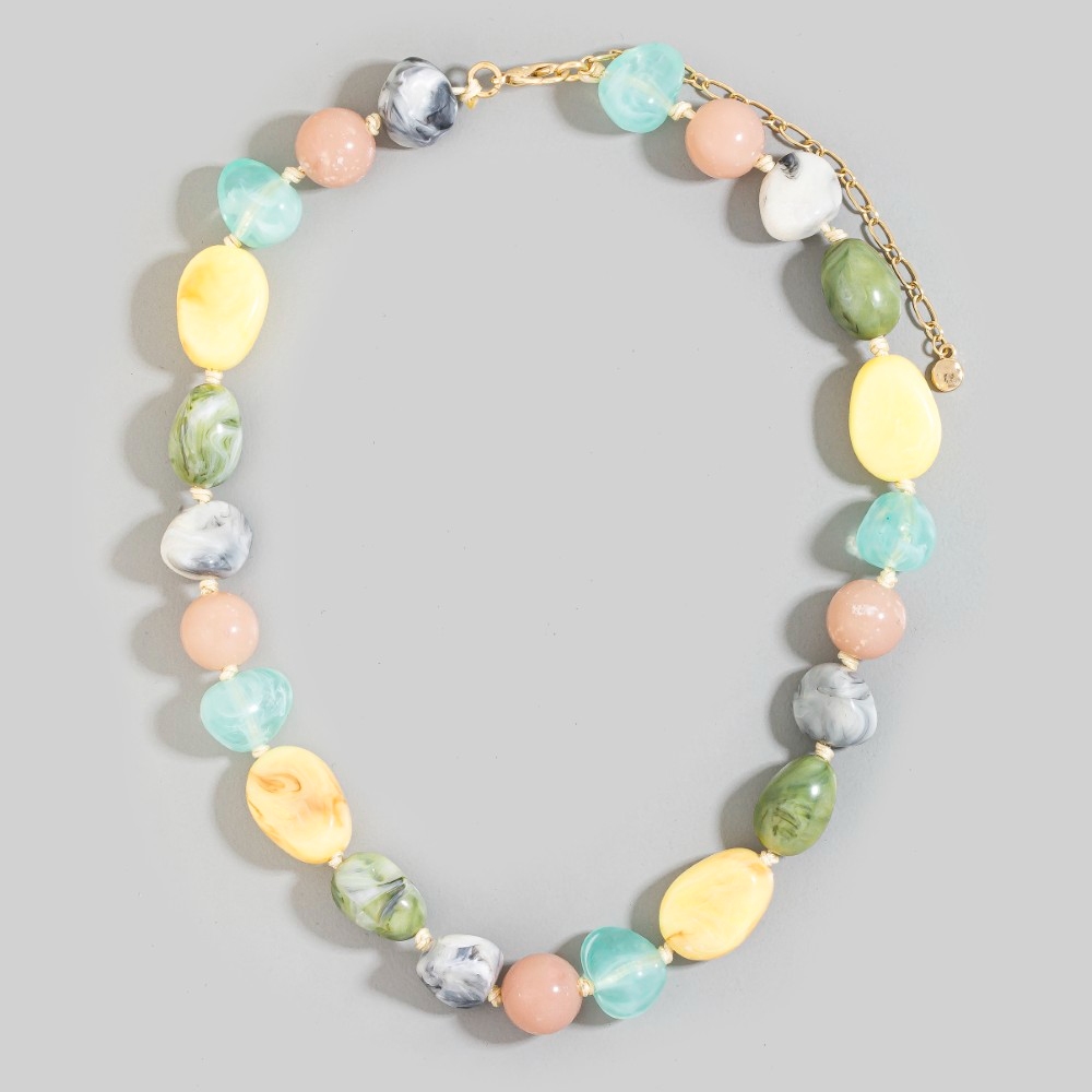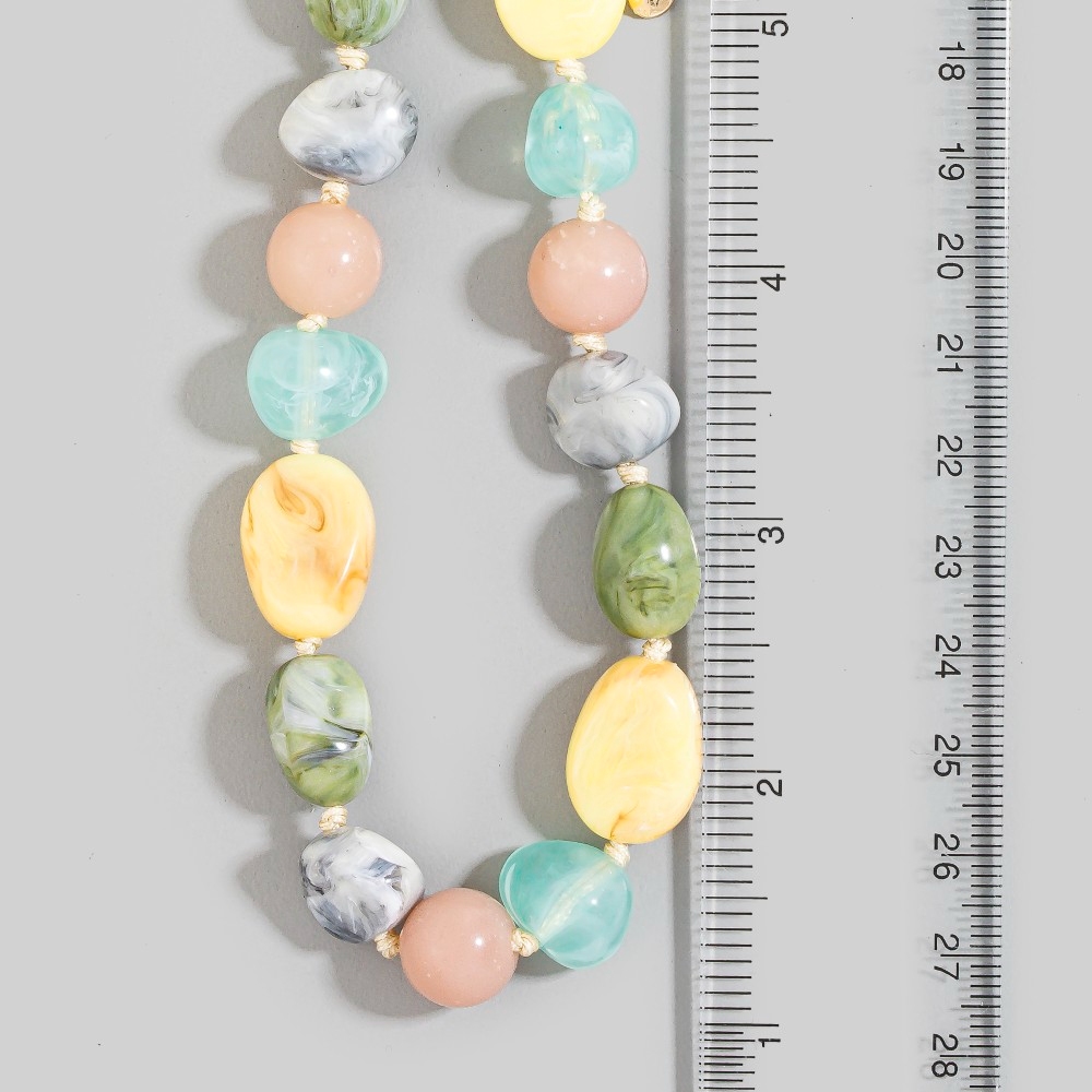 - This piece is a true showstopper, this necklace features an exceptional irregular marble resin beaded design. Perfect for adding a touch of glamour and sophistication to any outfit, this necklace is a must-have. Available in MU, NU, PK, TQ. This item is sold in packs of 1.