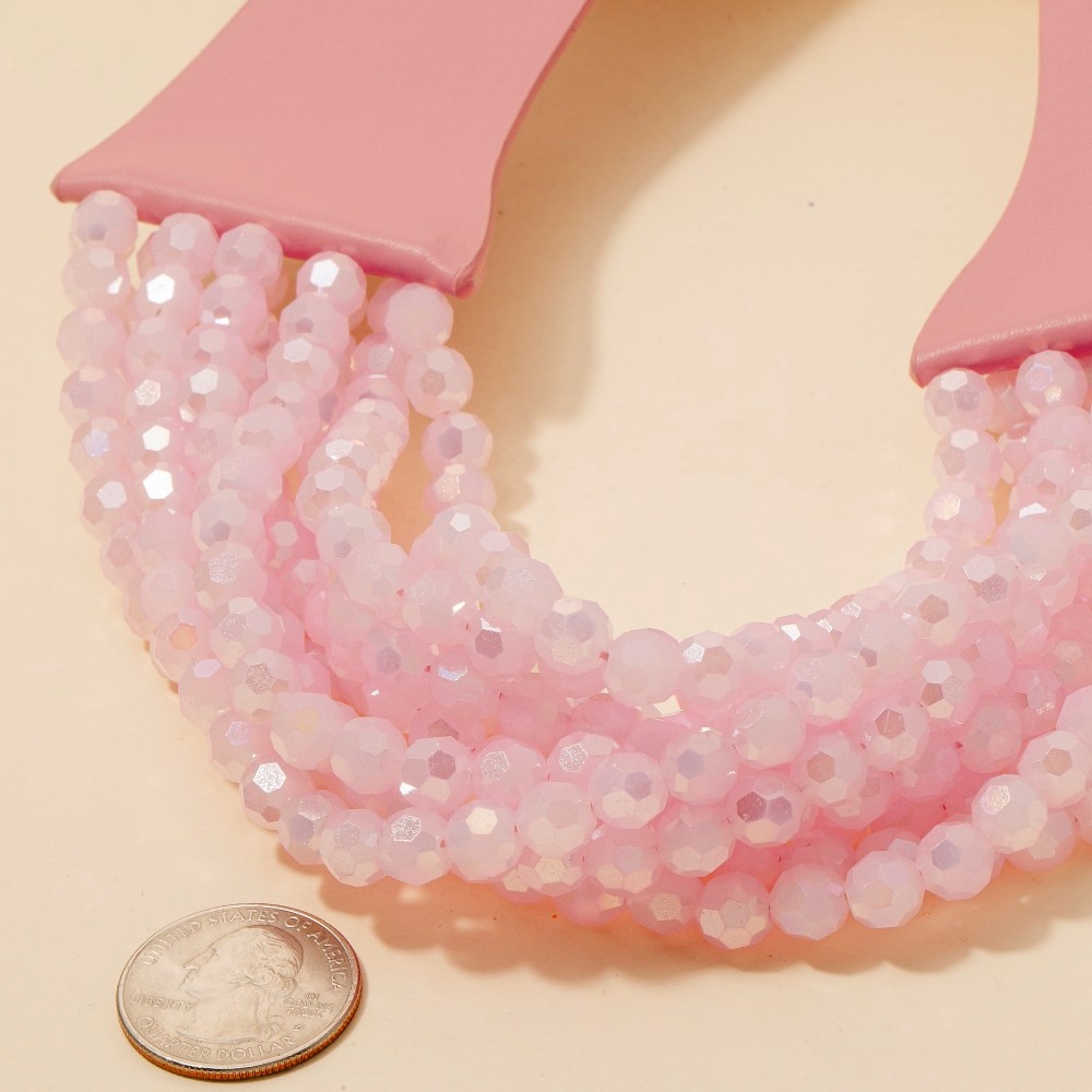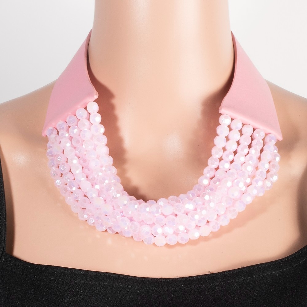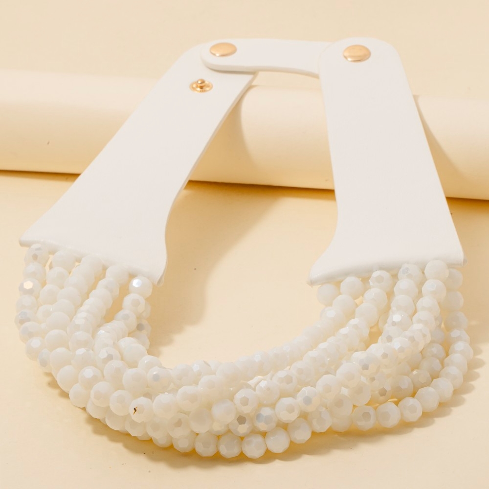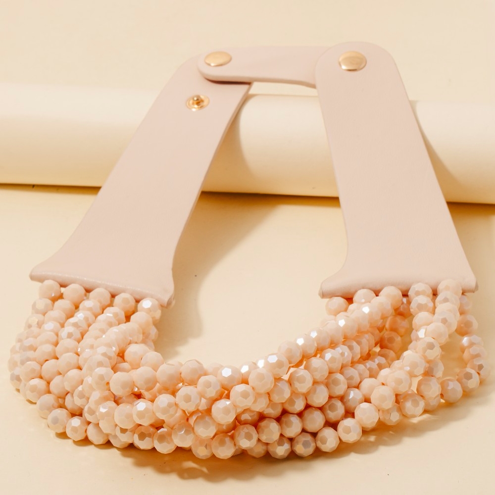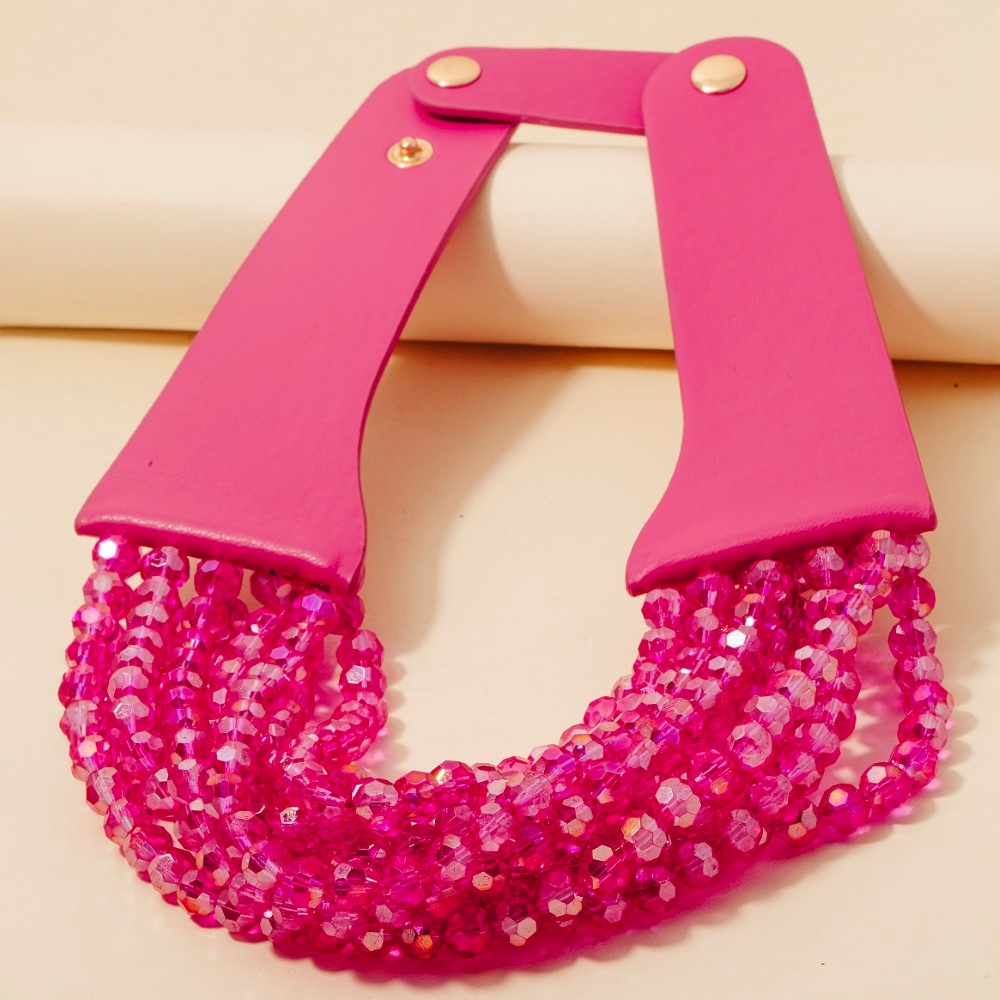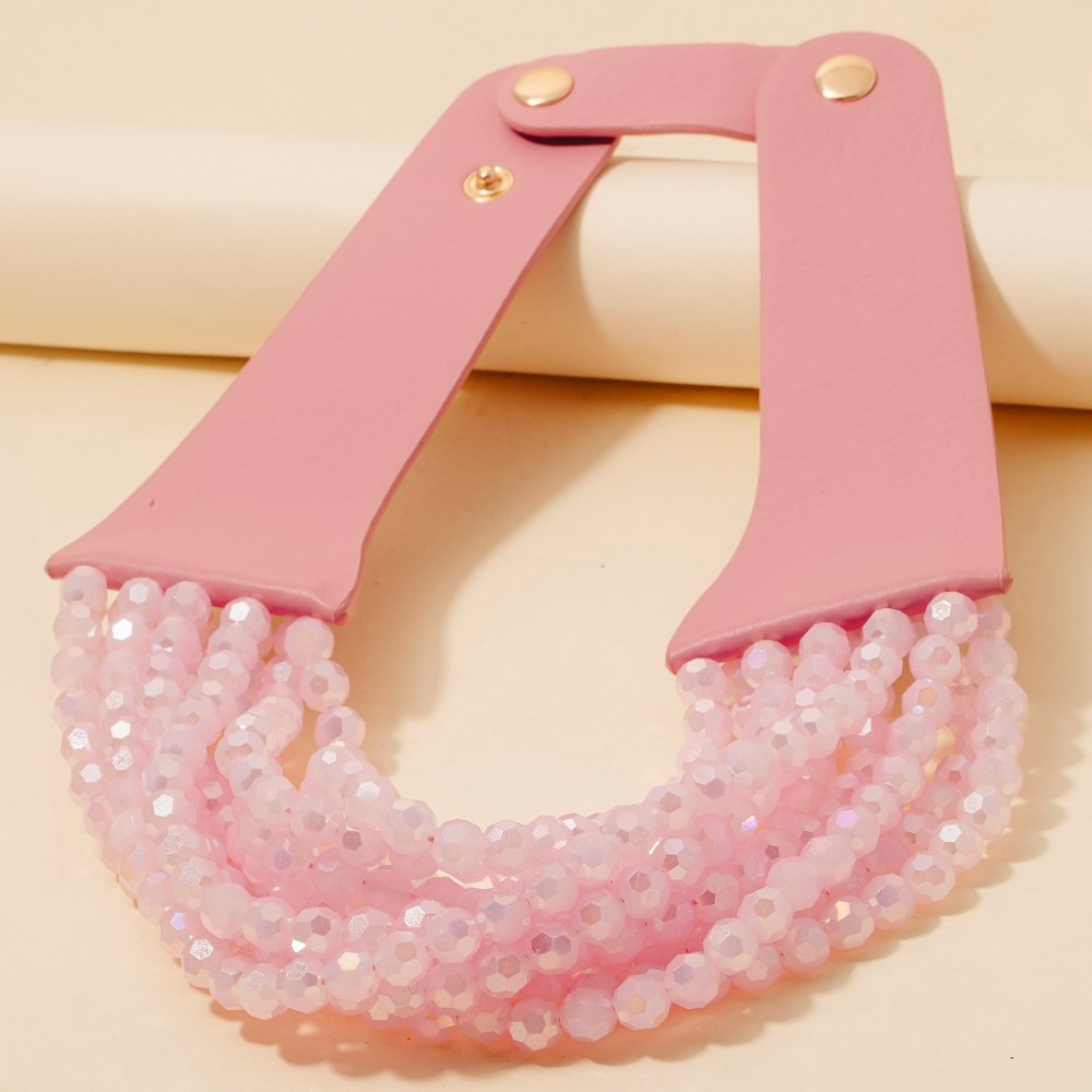 • A contemporary masterpiece, this necklace offers a remarkable faux leather and faceted beads statement design. Redefine your wardrobe with this versatile necklace, a timeless addition that brings an air of sophistication to any look. Available in BK, CH, FU, MI, NU, PK, WH. This item is sold in packs of 1.
