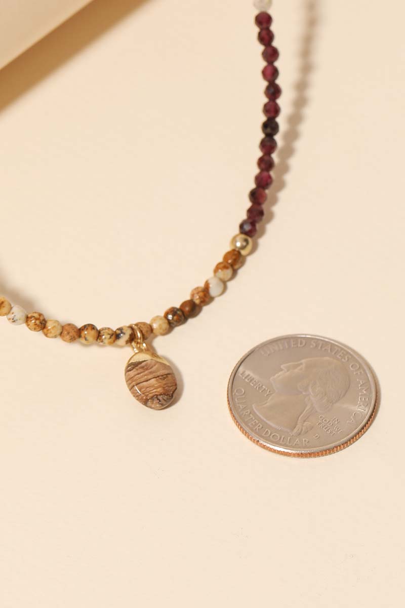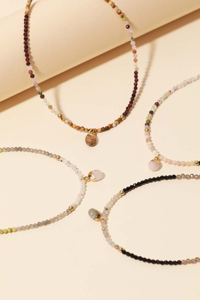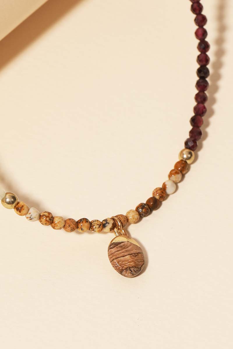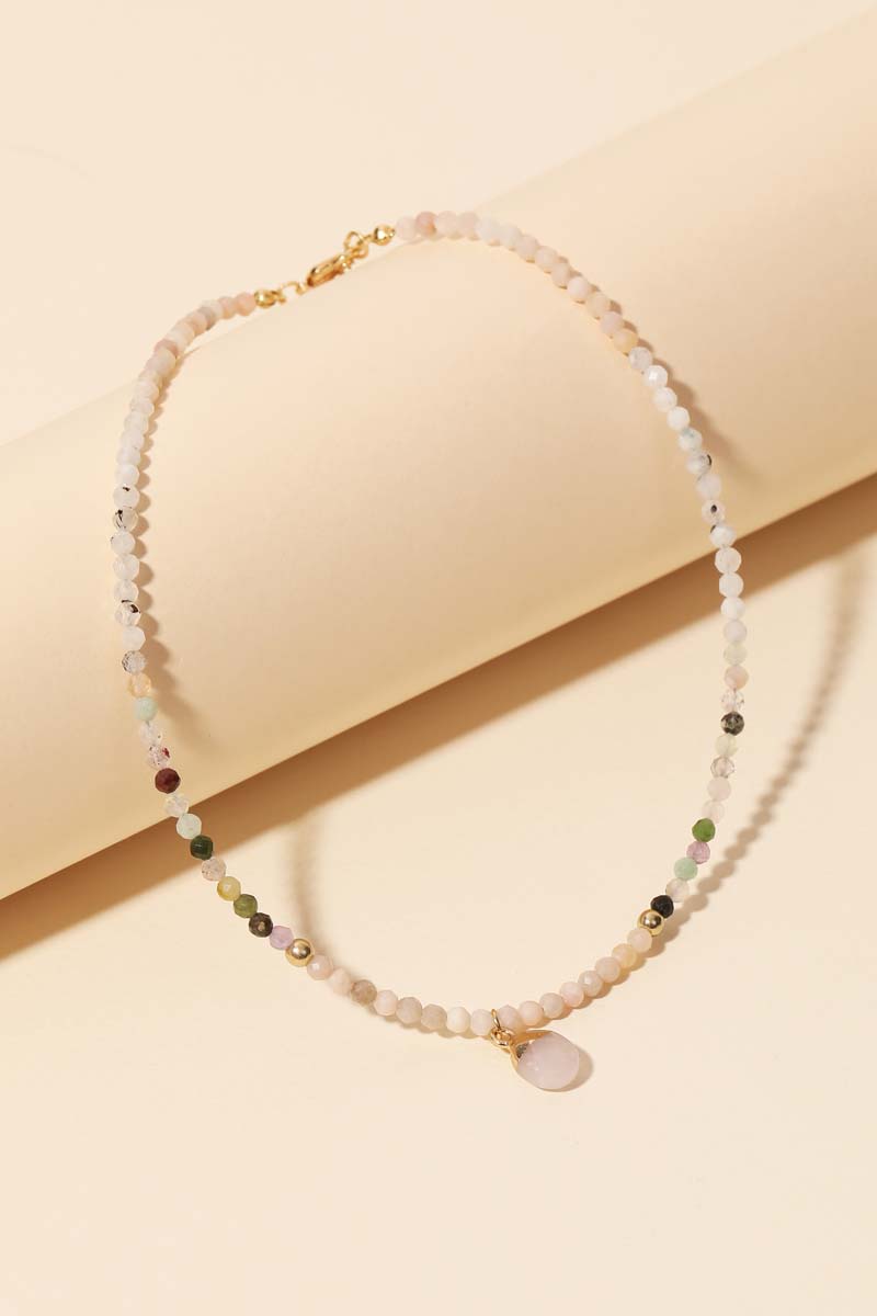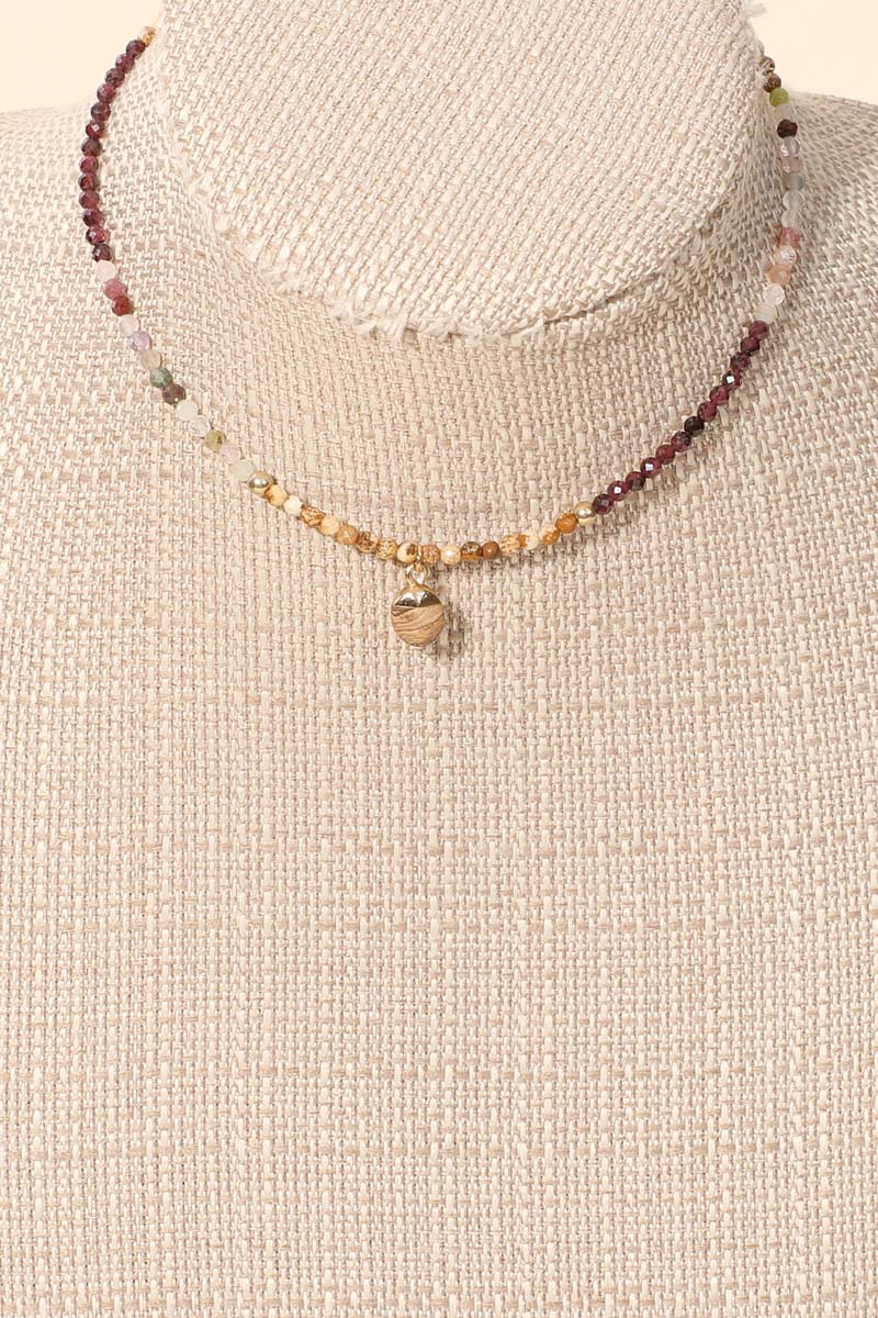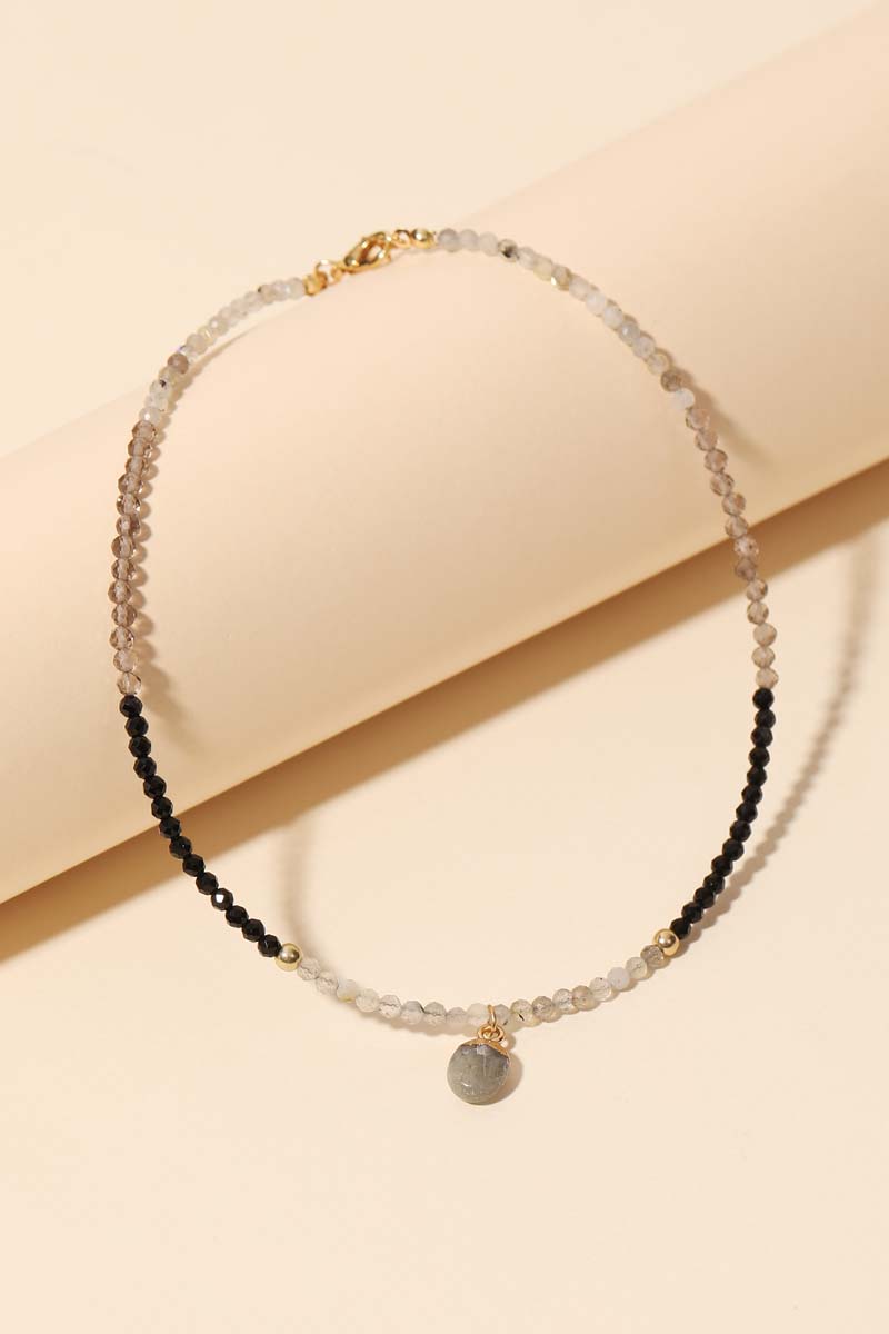 • This popular trending necklace has a beautiful oval stone charm ball beaded necklace design. Perfect for those who love making a fashion statement. Available in GDBRW, GDGY, GDPK and GDWH.