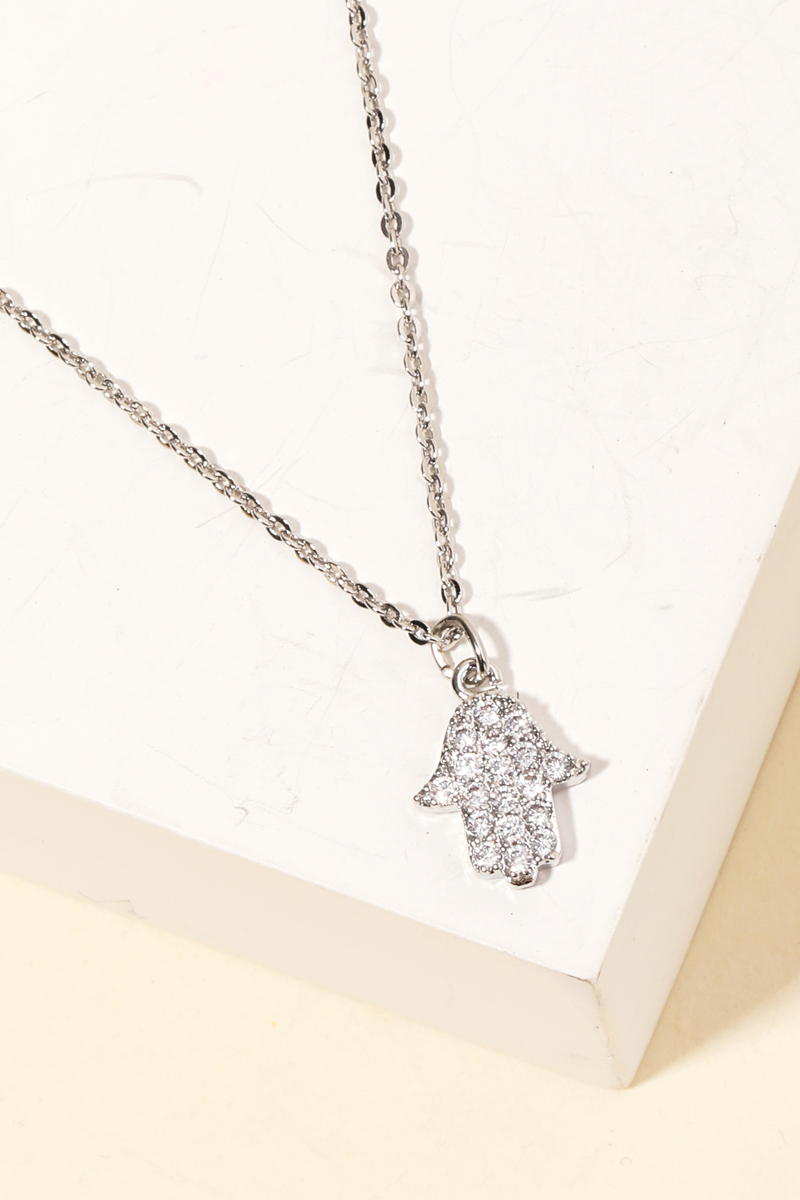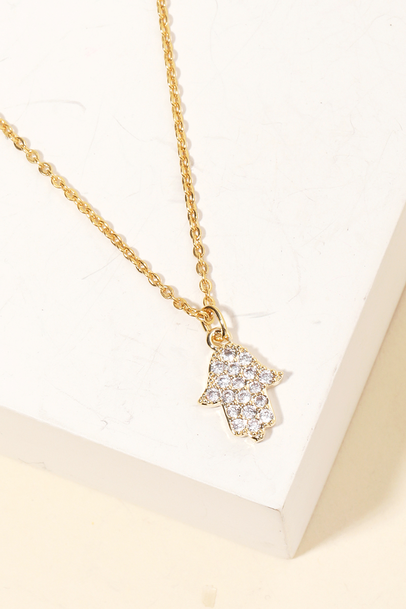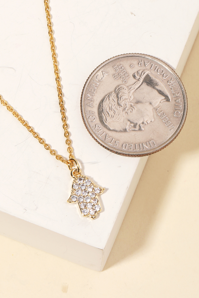 A must-have for any fashion-forward individual, this necklace reveals an intricate pave mini hamsa hand pendant necklace design. A must-have accessory that effortlessly enhances your style, no matter the occasion. Available in G and S. This item is sold in packs of 1.
