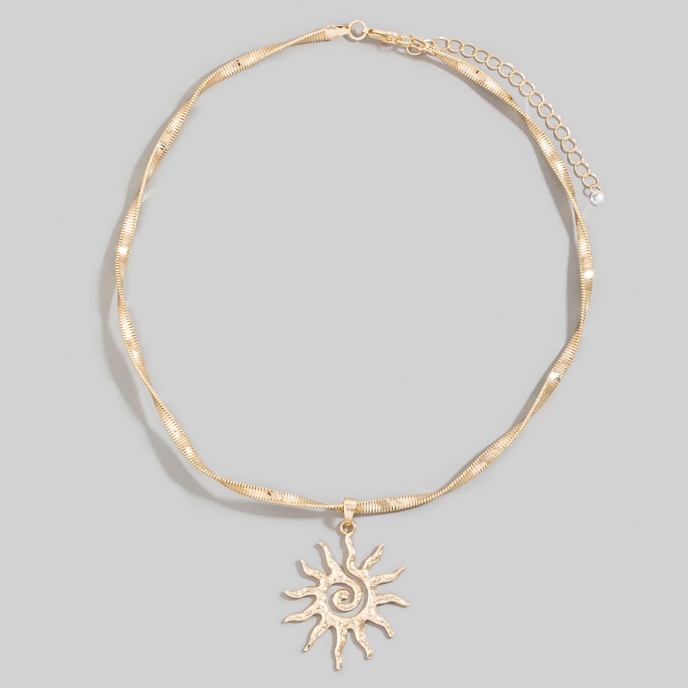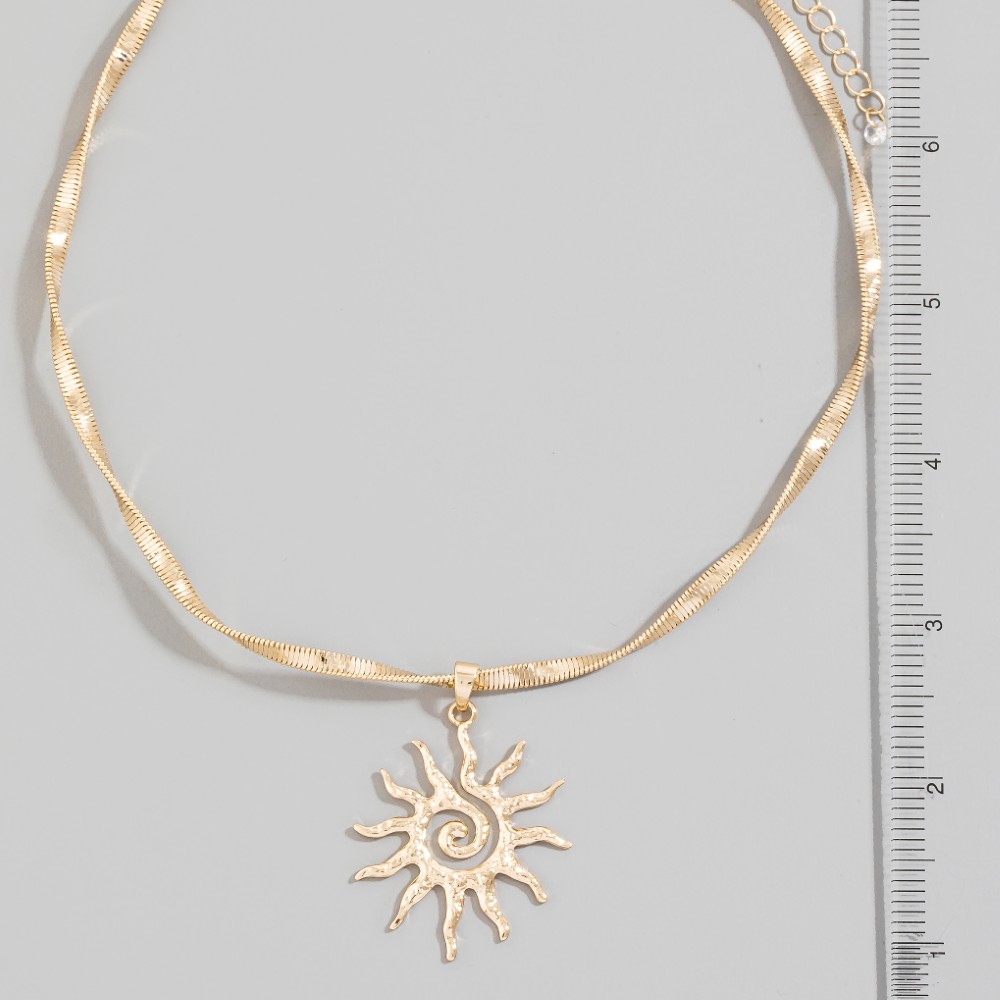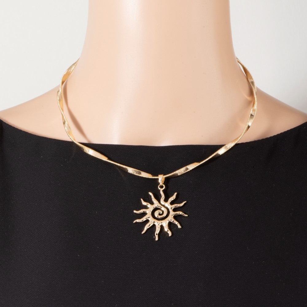 - Perfect for any occasion, from casual to formal, this pendant necklace incorporates a remarkable spiral sun pendant choker necklace design. Infuse a hint of luxury into your daily attire with this versatile pendant necklace, a must-have for those who appreciate timeless elegance. Available in G. This item is sold in packs of 1.
