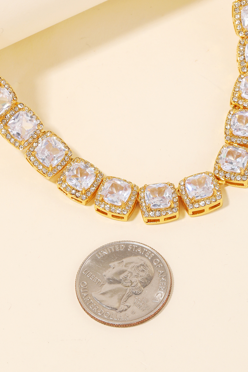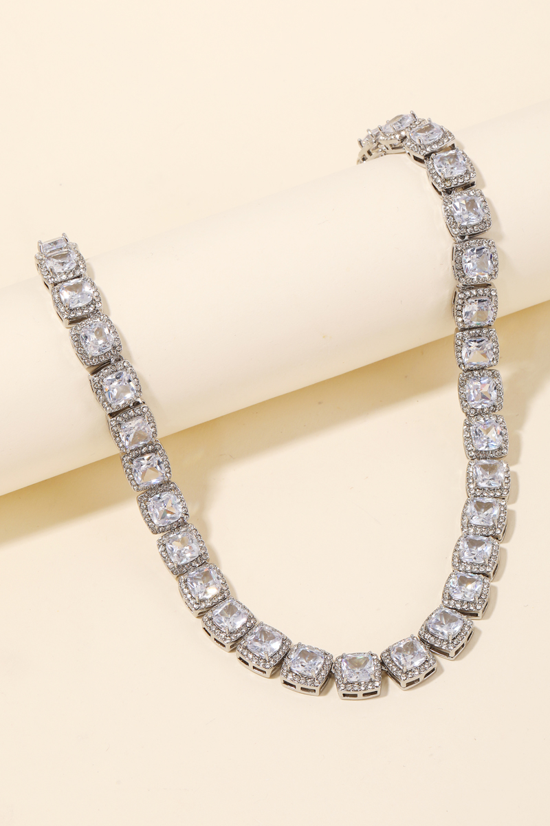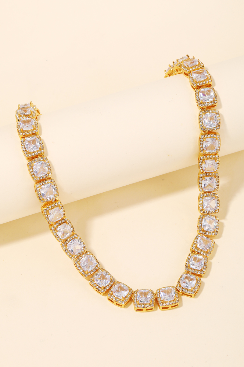 A contemporary masterpiece, this necklace radiates a sleek square rhinestone link choker necklace design. Perfect for dressing up or down, this versatile accessory adds a touch of sophistication to any look. This item is sold in packs of 1.