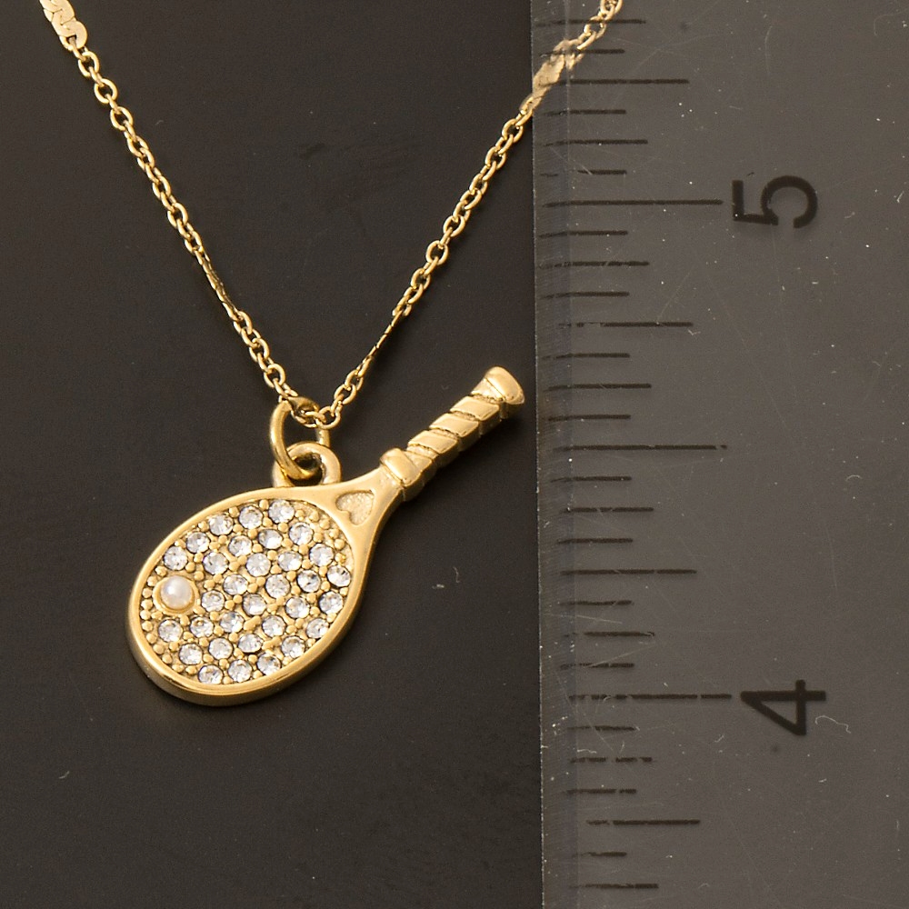 - Add a touch of luxury to any outfit, this necklace presents a striking stainless steel cubic zirconia and pearl pave tennis racket pendant design. This item is ideal for those who want to add some personality to their wardrobe without being too bold. Available in G. This item is sold in packs of 1.
