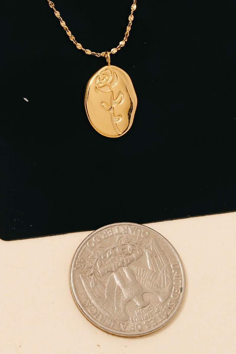 - Elevate any look, this necklace emanates an elegant stainless steel rose engraved pendant design. A perfect addition to your wardrobe that effortlessly enhances your style. Available in G. This item is sold in packs of 1.