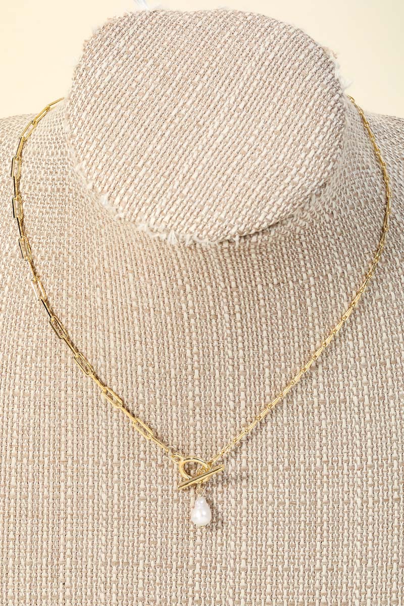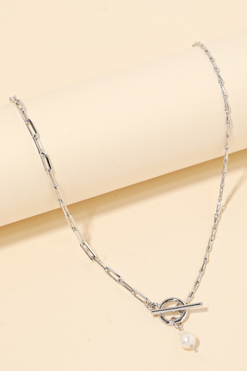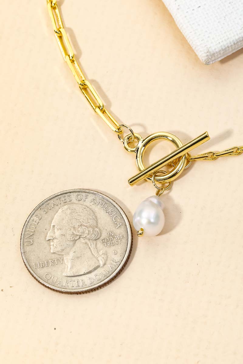 A classic charming must have necklace have a toggle chain pearl charm necklace design. Perfect for the coming Spring season. Available in G and S. This item is sold in packs of 1.