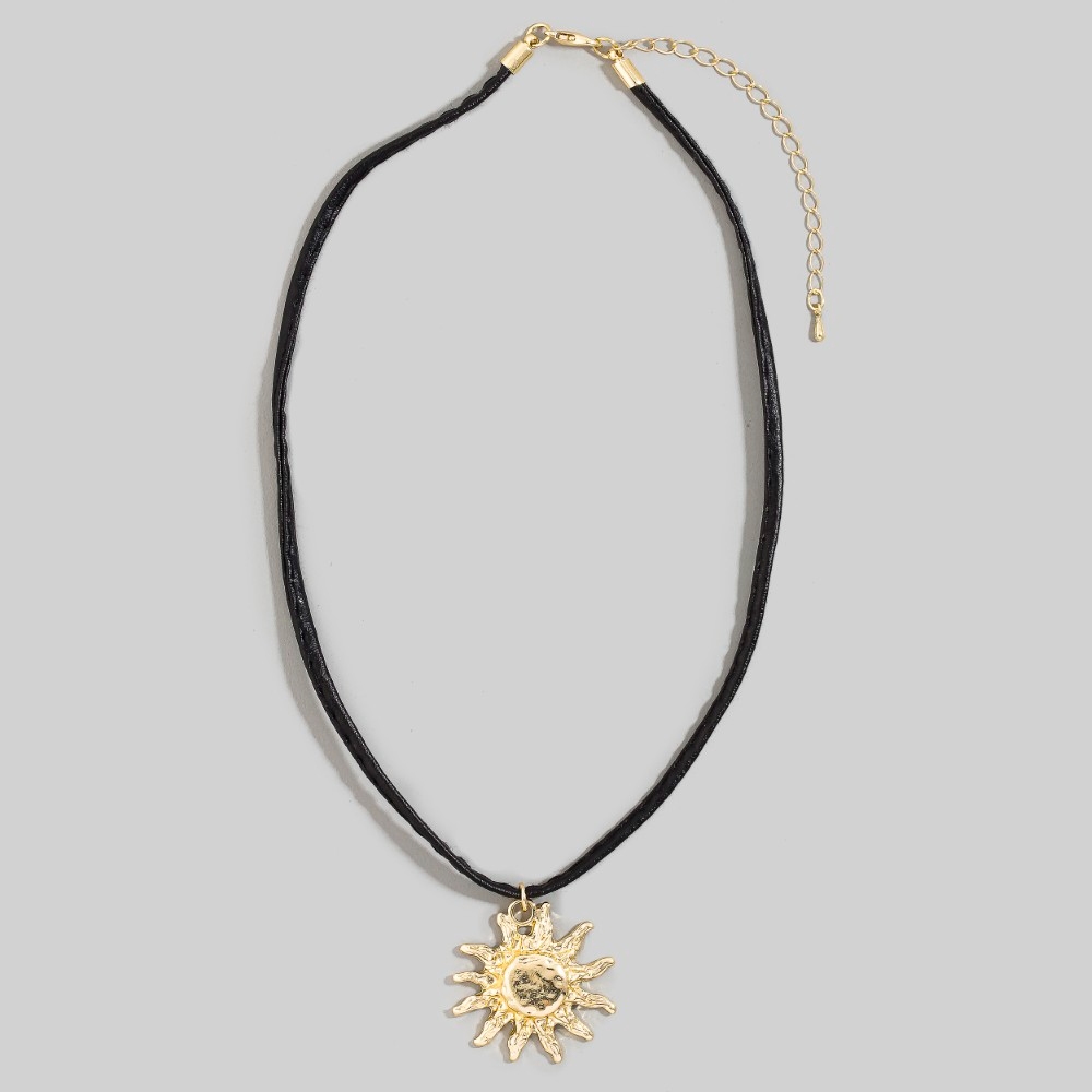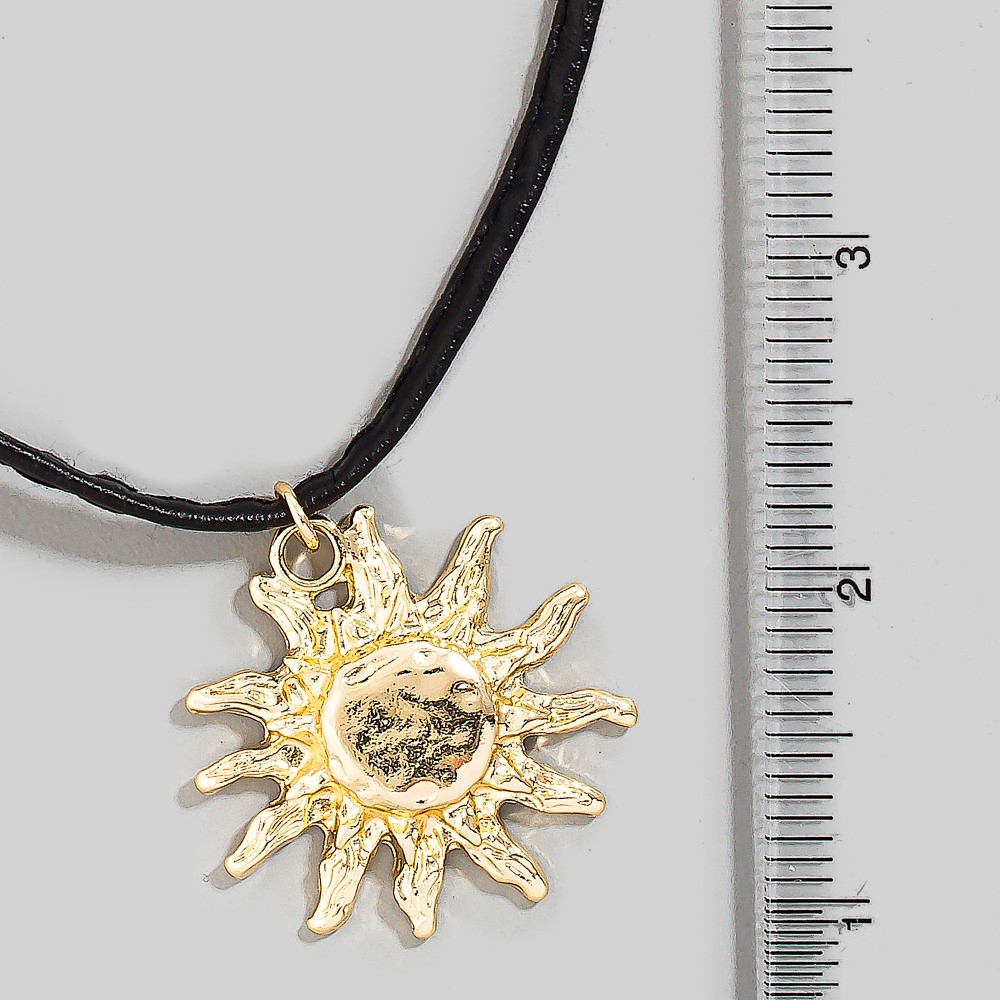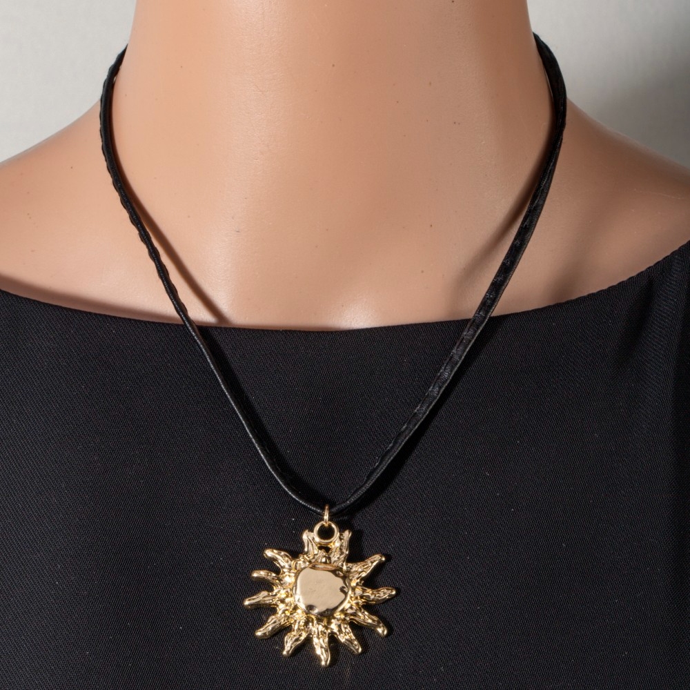 Sleek and modern, this pendant necklace emanates an elegant warped sun pendant cord necklace design. Elevate your style effortlessly with this versatile pendant necklace, enhancing the appeal of any ensemble. This item is sold in packs of 1.