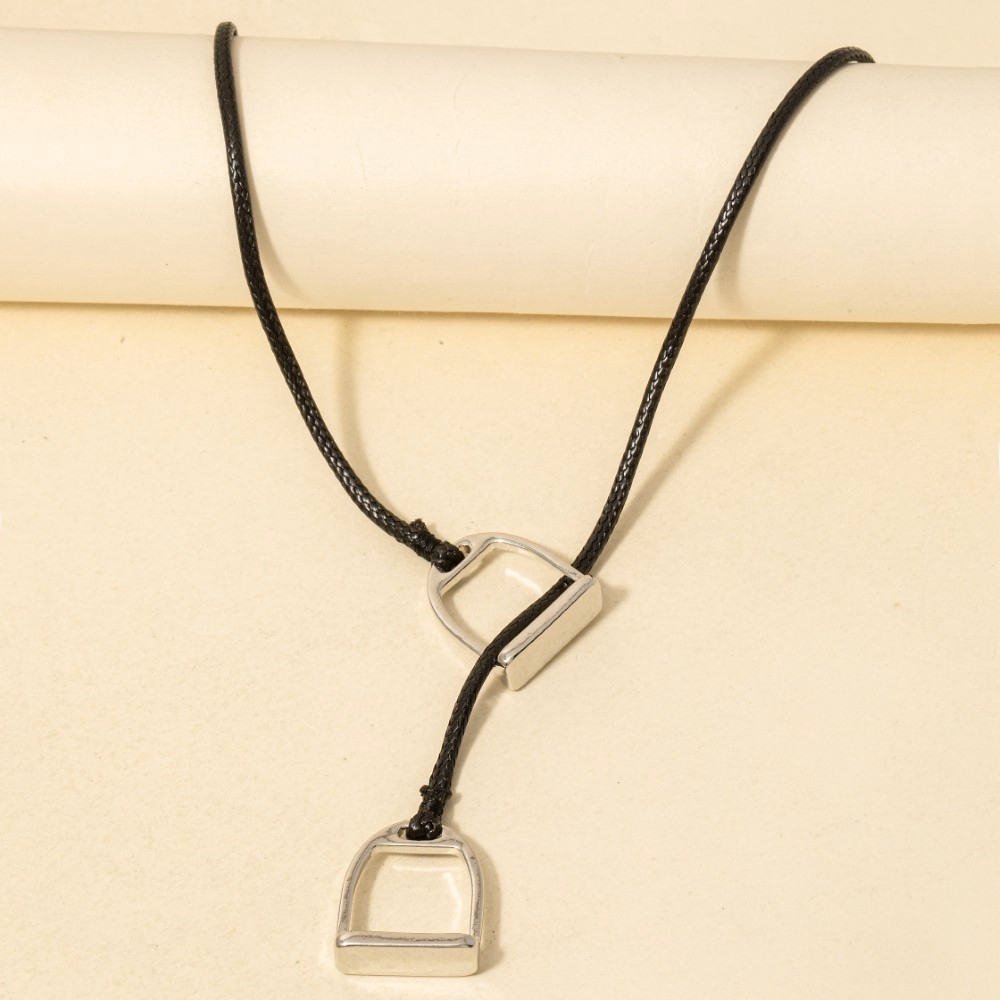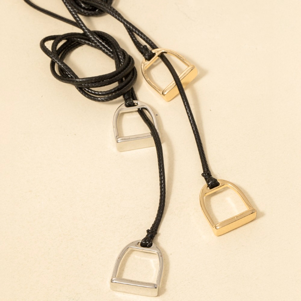 - A timeless piece that you'll wear for years to come, this necklace features an exceptional wide bottom horse bit pendant leather cord design. Embrace fashion flexibility with this versatile necklace, designed to effortlessly enhance the sophistication of any outfit. Available in GDBLK, RHBLK. This item is sold in packs of 1.