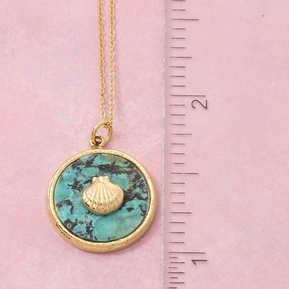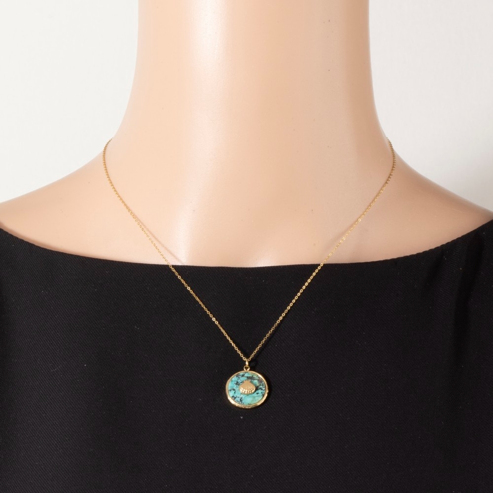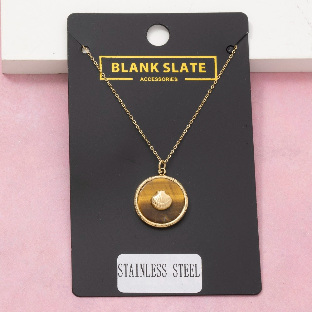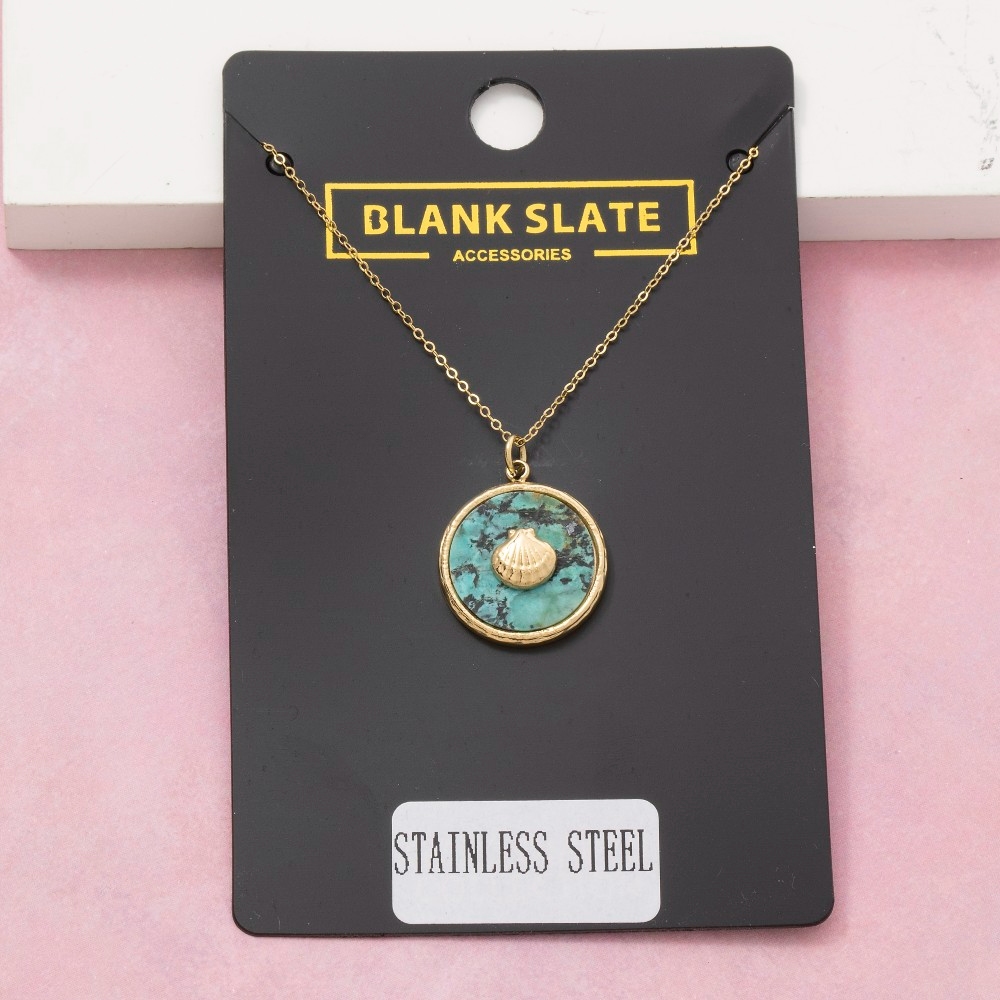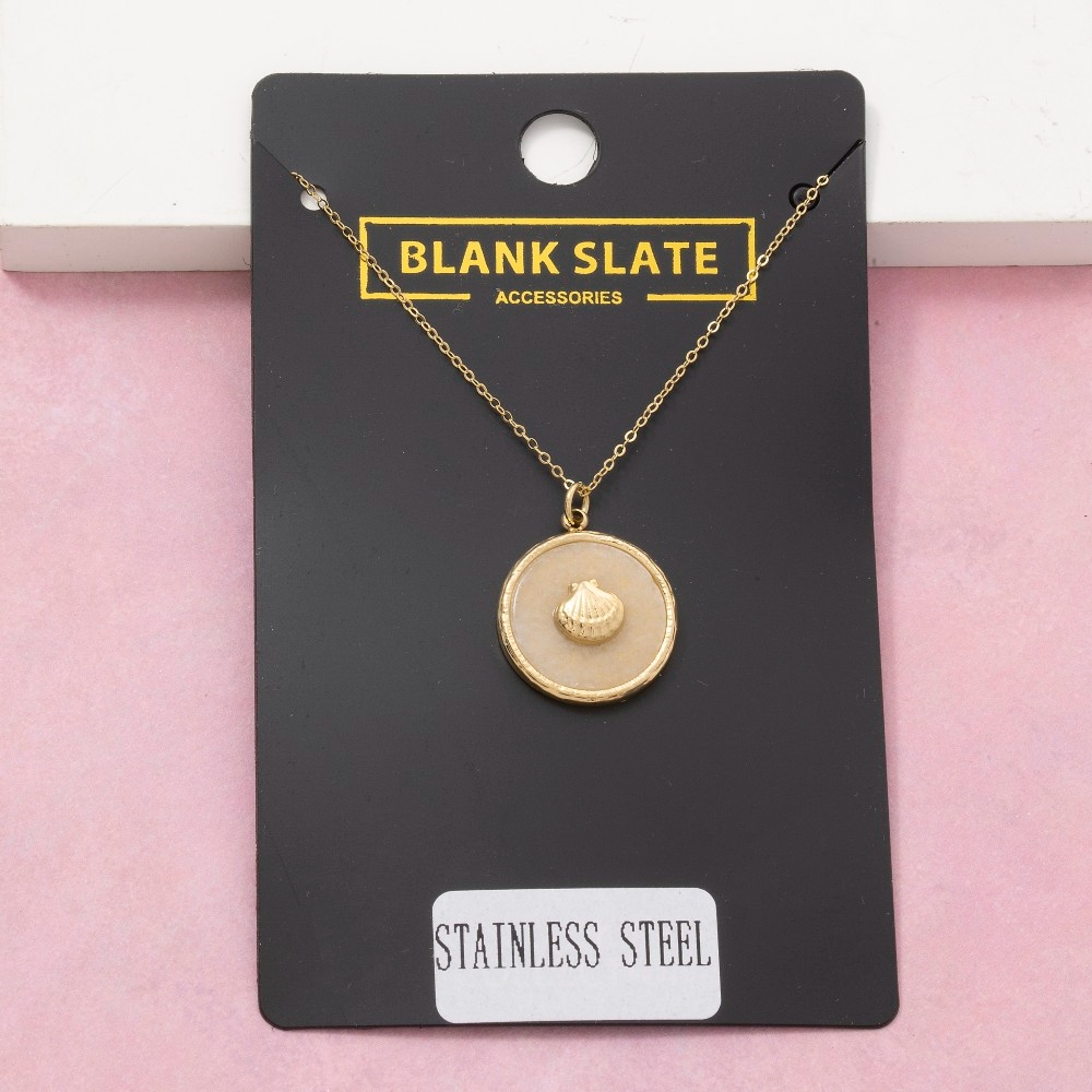 • Perfect for any fashion-forward individual, this pendant necklace embodies a sophisticated stainless steel semiprecious stone shell coin design. This pendant necklace is the perfect finishing touch to any outfit, adding a touch of sophistication and glamour. Available in BR, GN, IV. This item is sold in packs of 1.