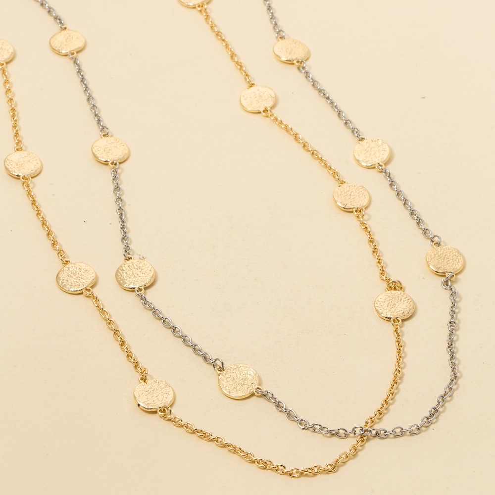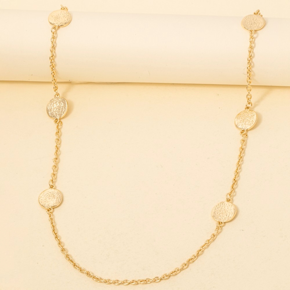Elevate your style with something unique and daring, this chain necklace possesses a fine textured station coins long design. This chain necklace is a great way to add some flair to your outfit without going over the top. Available in GDRH and GD. This item is sold in packs of 12.