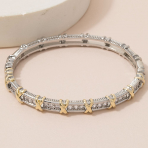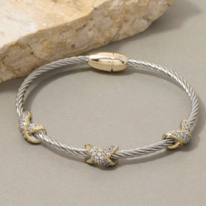Two-Tone Cable Wire Cz X-Station Bangle Bracelet