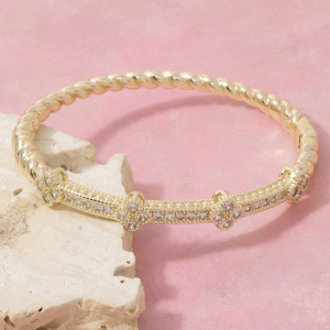 Gold Twisted Rope Cz Flower Station Bangle Bracelet