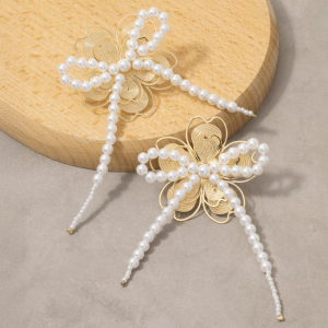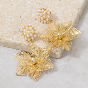 Gold Filigree Flower & Pearl Bow Drop Earrings