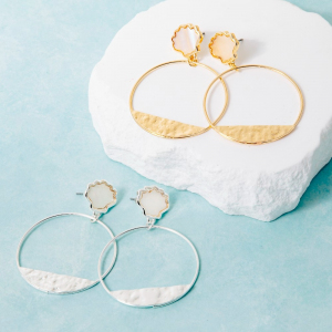 White Stone Scallop Stud Hammered Hoop Drop Earrings
