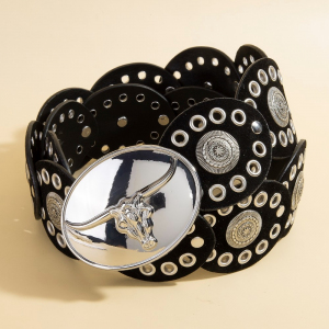 Bull Head Oval Buckle Faux Leather Disc Belt
