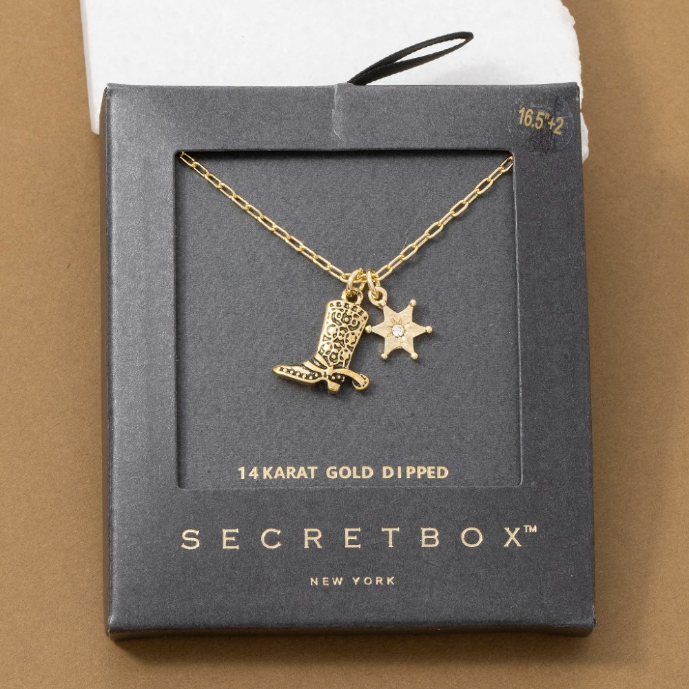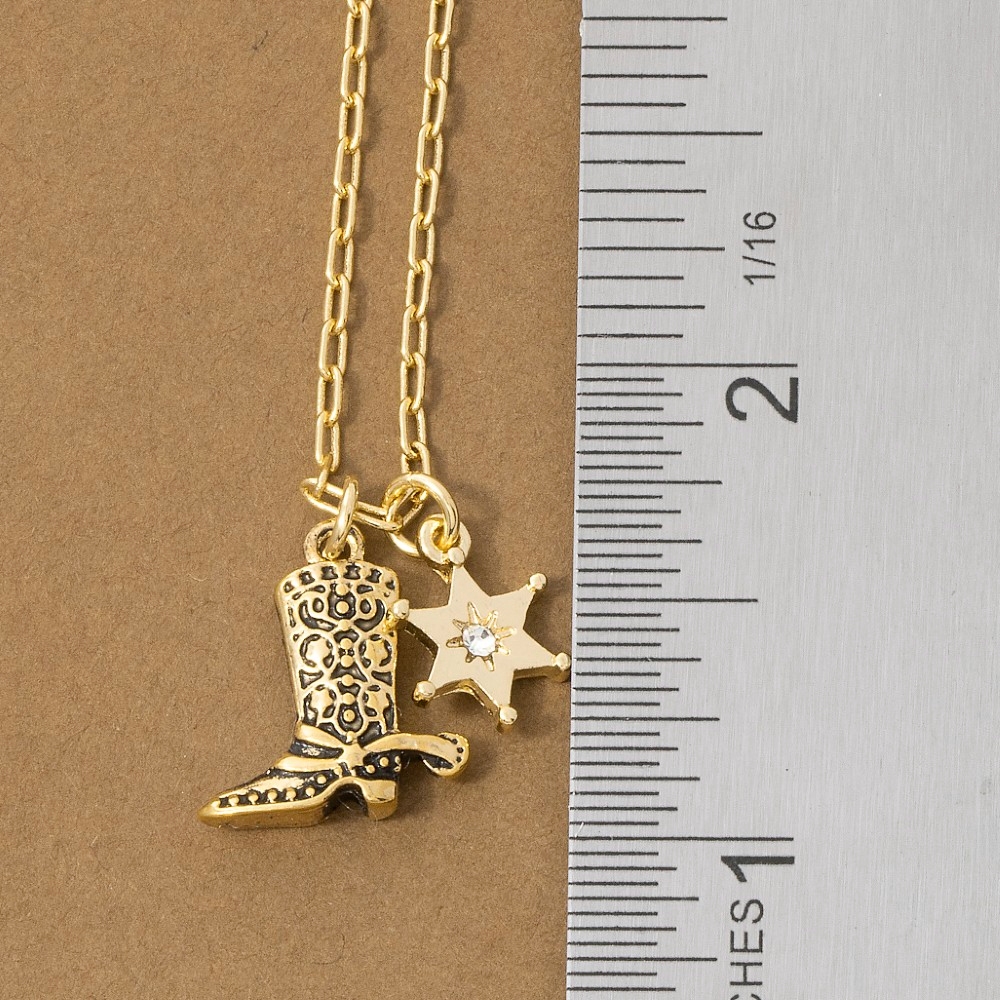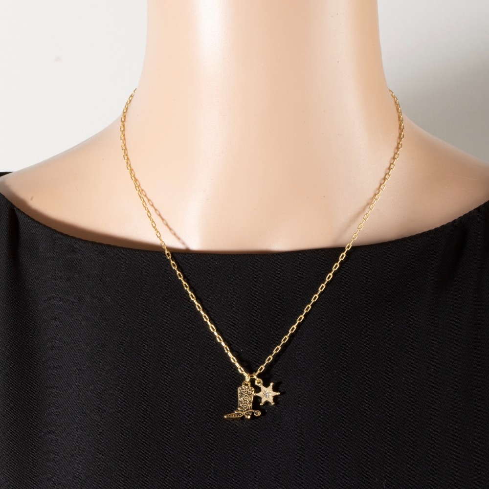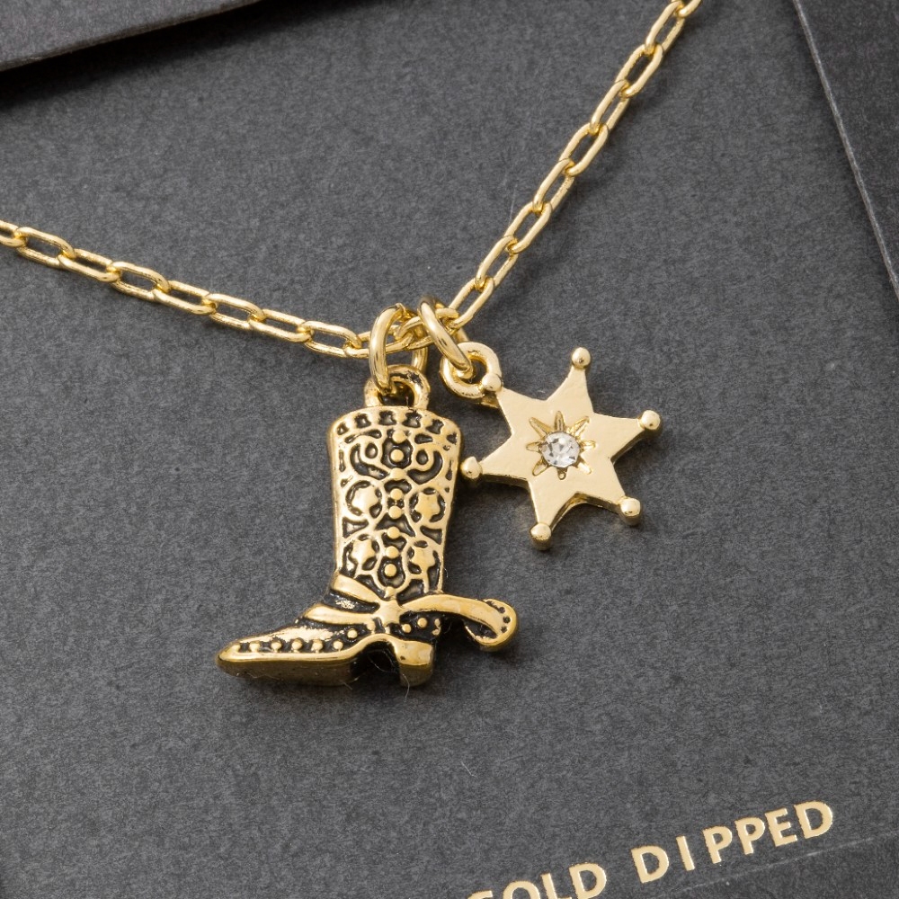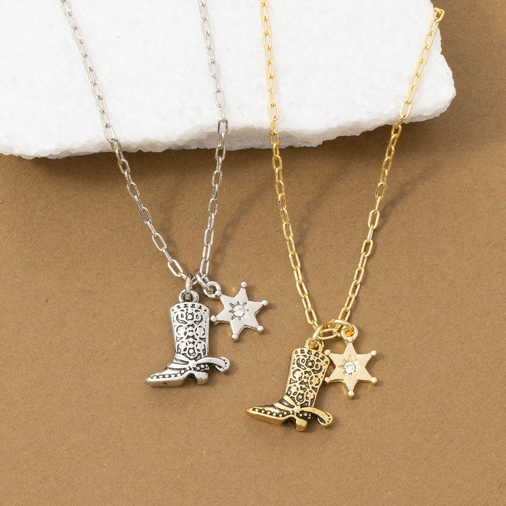The perfect way to add some edge to your look, this necklace introduces an exceptional 14k gold dipped cowboy boot star design. Unleash the potential of your wardrobe with this versatile necklace, ensuring a touch of elegance in every ensemble. Available in GD, WG. This item is sold in packs of 1.
