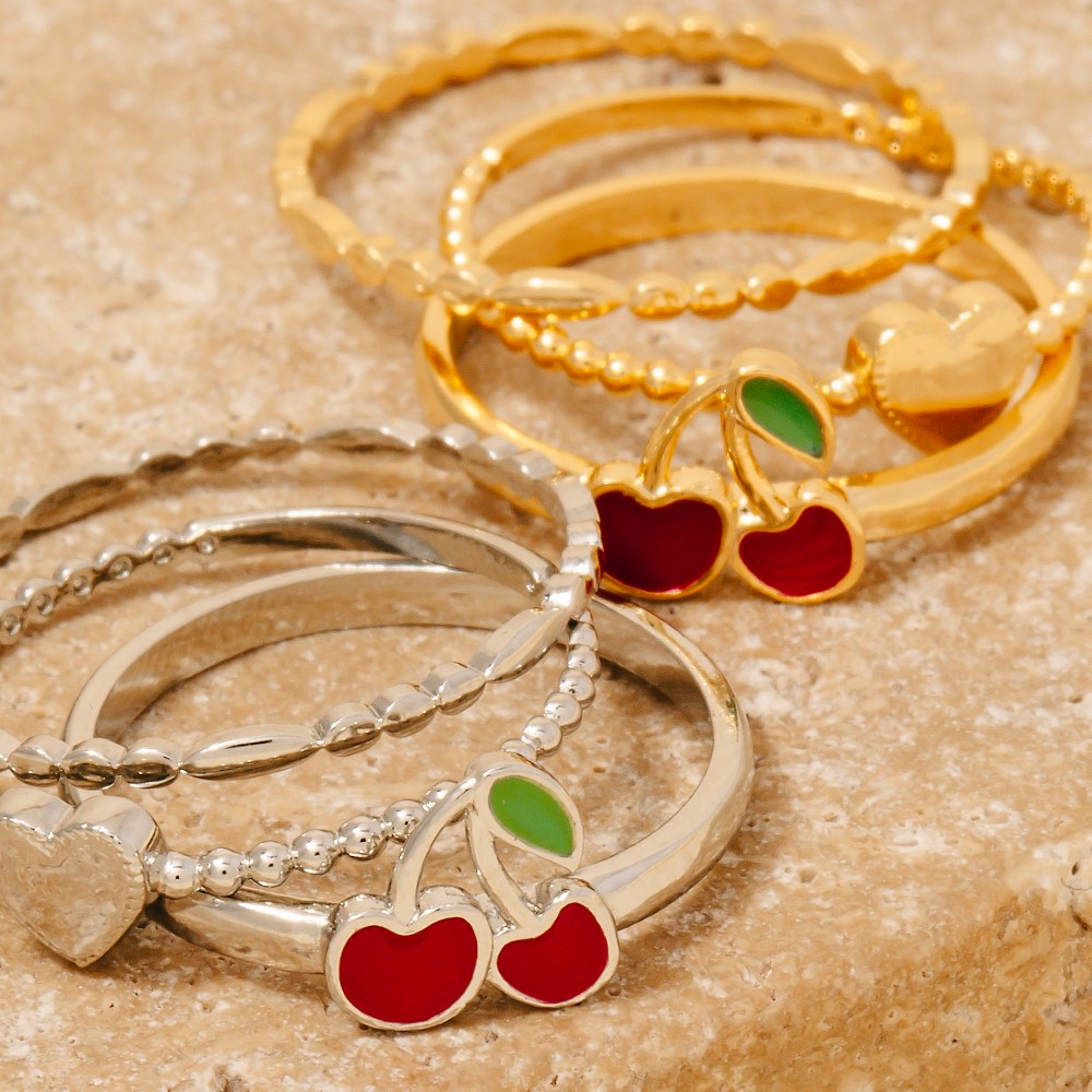 Stay on-trend and stand out from the crowd, this ring radiates a sleek 3pc heart and cherry station band set design. Transform your outfit from ordinary to extraordinary with the touch of elegance provided by this versatile ring. Available in GDMLT, RHMLT. This item is sold in packs of 1.