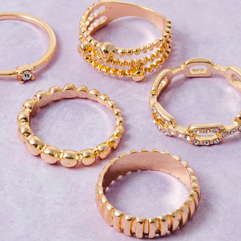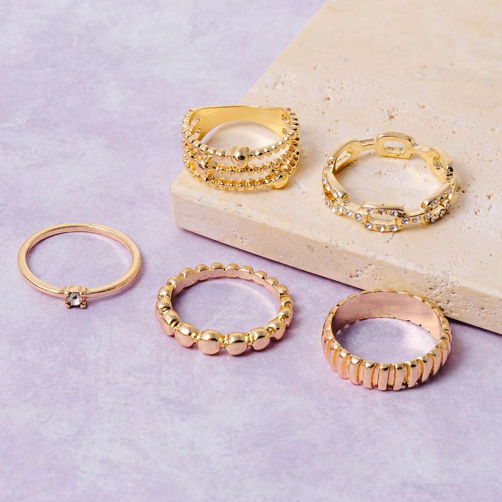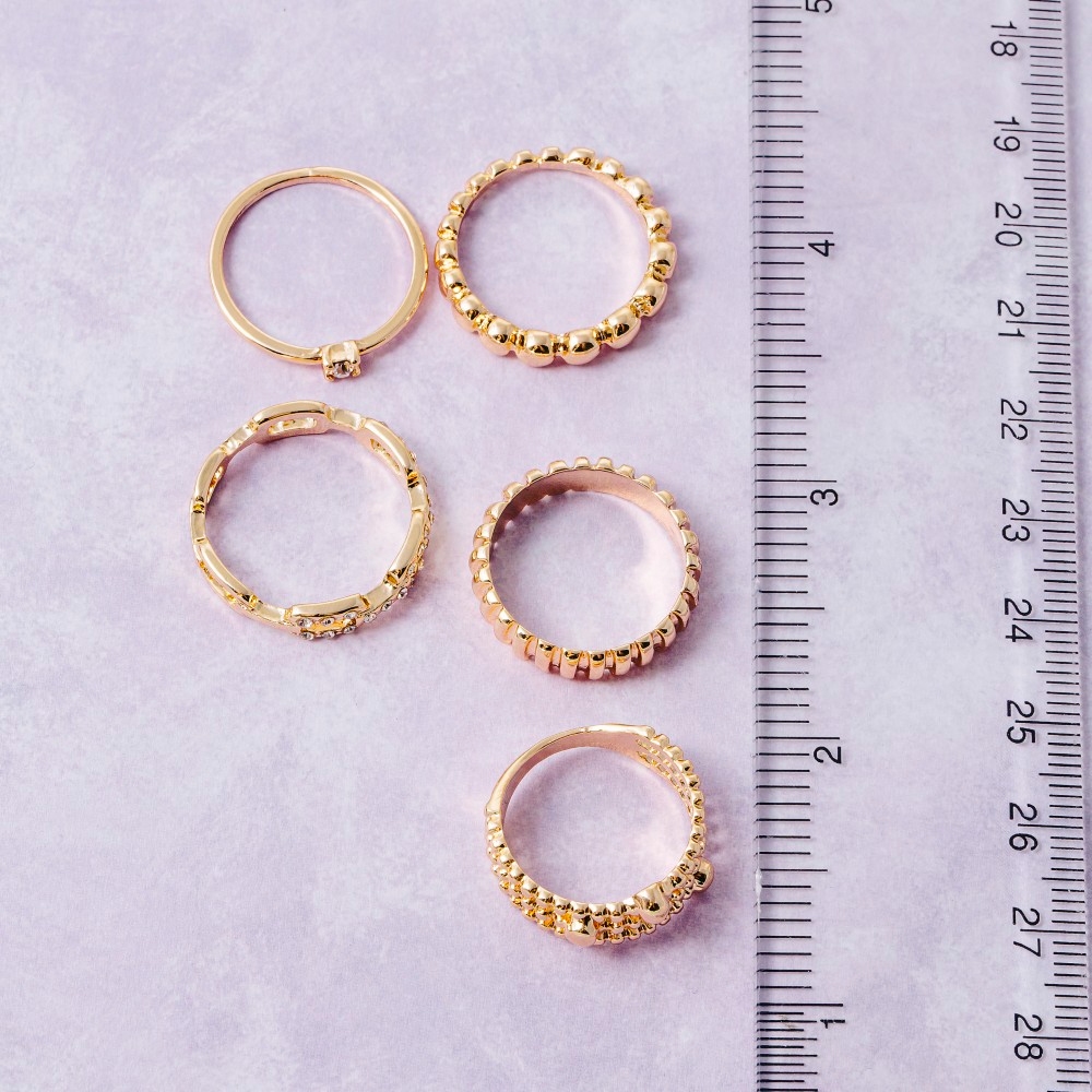 The perfect way to showcase your unique style, this ring offers a remarkable 5-piece mixed style stackable set design. The perfect way to elevate any outfit, this ring adds a touch of elegance and style. Available in G. This item is sold in packs of 1.
