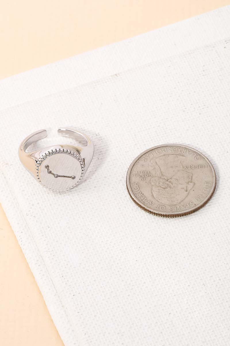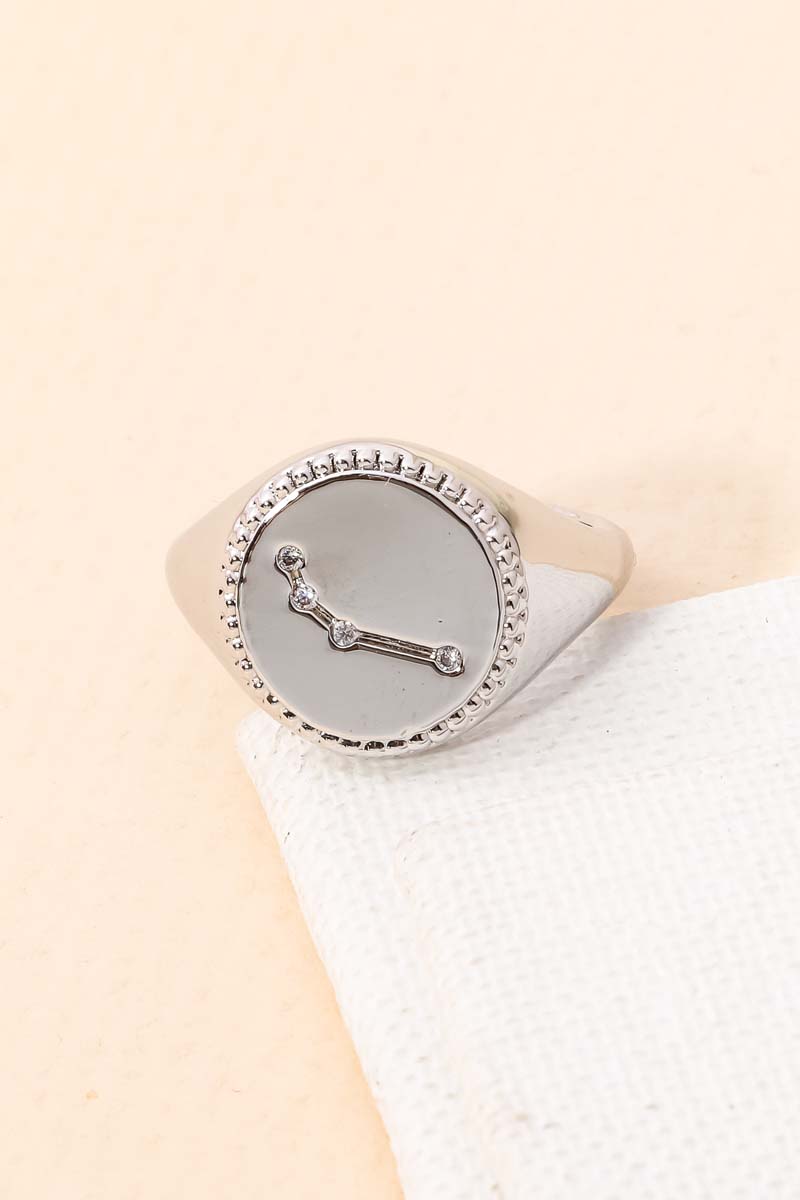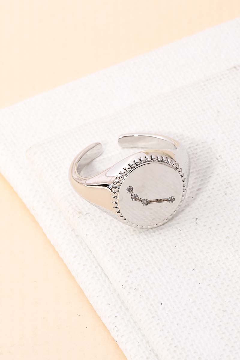 • An elegant, classy, chic and absolutely extravagant stunning must have open band signet ring that is made to be slightly adjustable. This gorgeous ring features a metallic polished shiny finish and a zodiac constellation engraved and studded at its top. This gorgeous ring is perfect for daily wear and can go with any outfit perfectly. This item is sold in packs of 1.