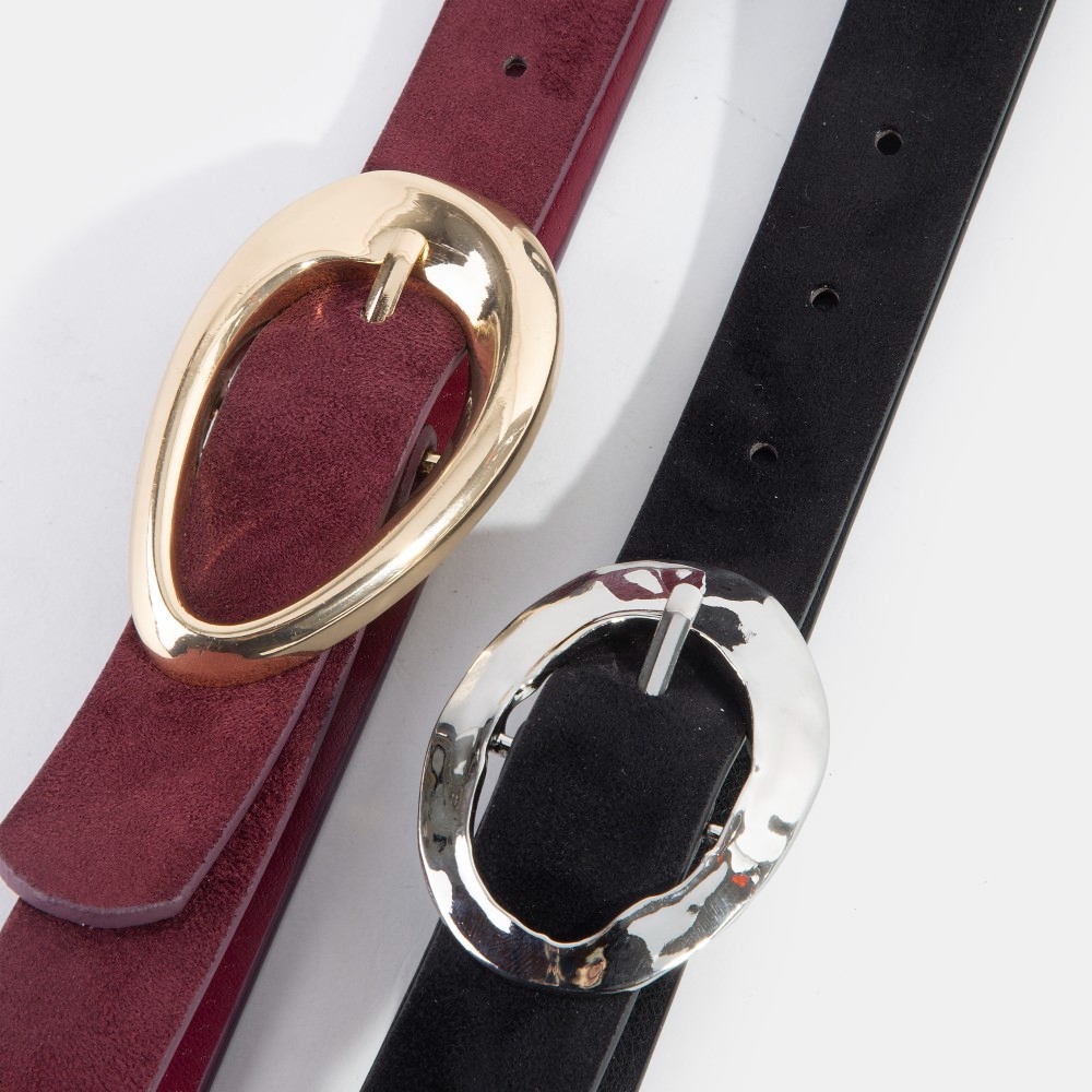 • Perfect for any fashion-forward individual, this belt set highlights a special assorted two piece oval buckle vegan leather design. This belt set is a great way to add some flair to your outfit without going over the top. This item is sold in packs of 1.