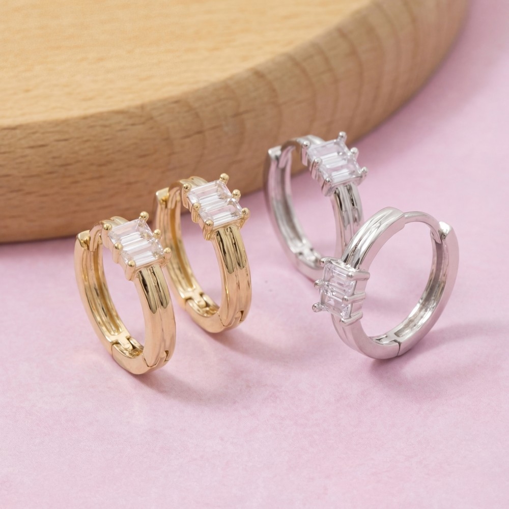 - Perfect for any fashion-forward individual, this pair of hoop earrings encompasses a grand baguette cubic zirconia huggie design. Elevate your outfit with this stylish pair of hoop earrings that's perfect for any occasion. This item is sold in packs of 12.