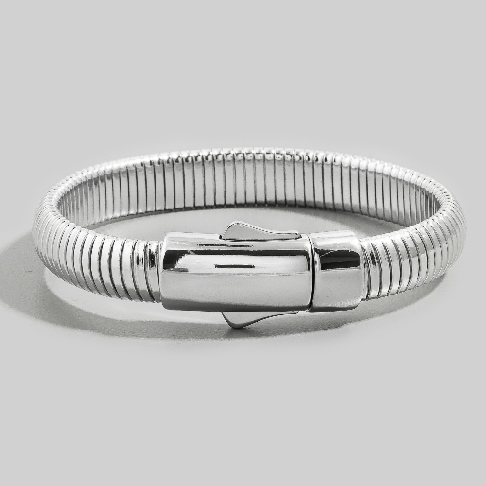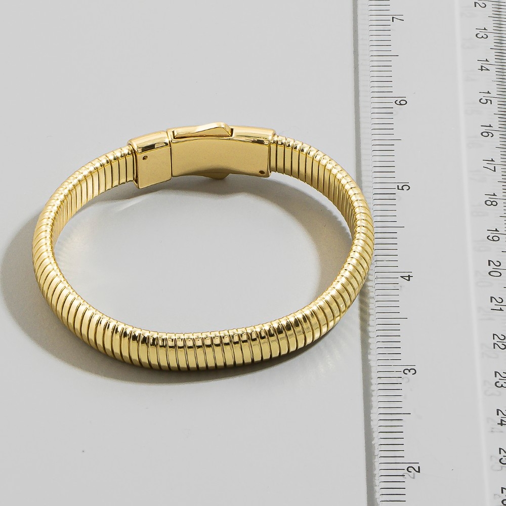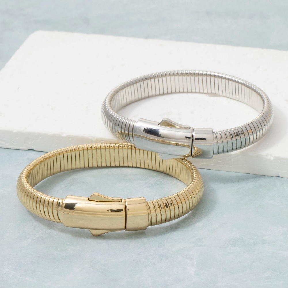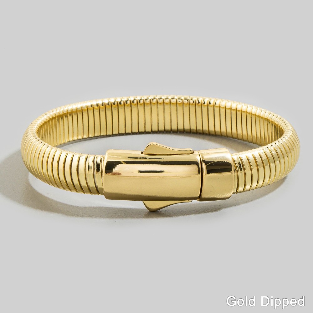This piece is perfect for those who want to showcase their unique style, this bracelet flaunts a luxurious barrel clasp wide ribbed tube design. Transform your outfit from ordinary to extraordinary with the touch of elegance provided by this versatile bracelet. Available in GOLD, 2SILVER. This item is sold in packs of 1.