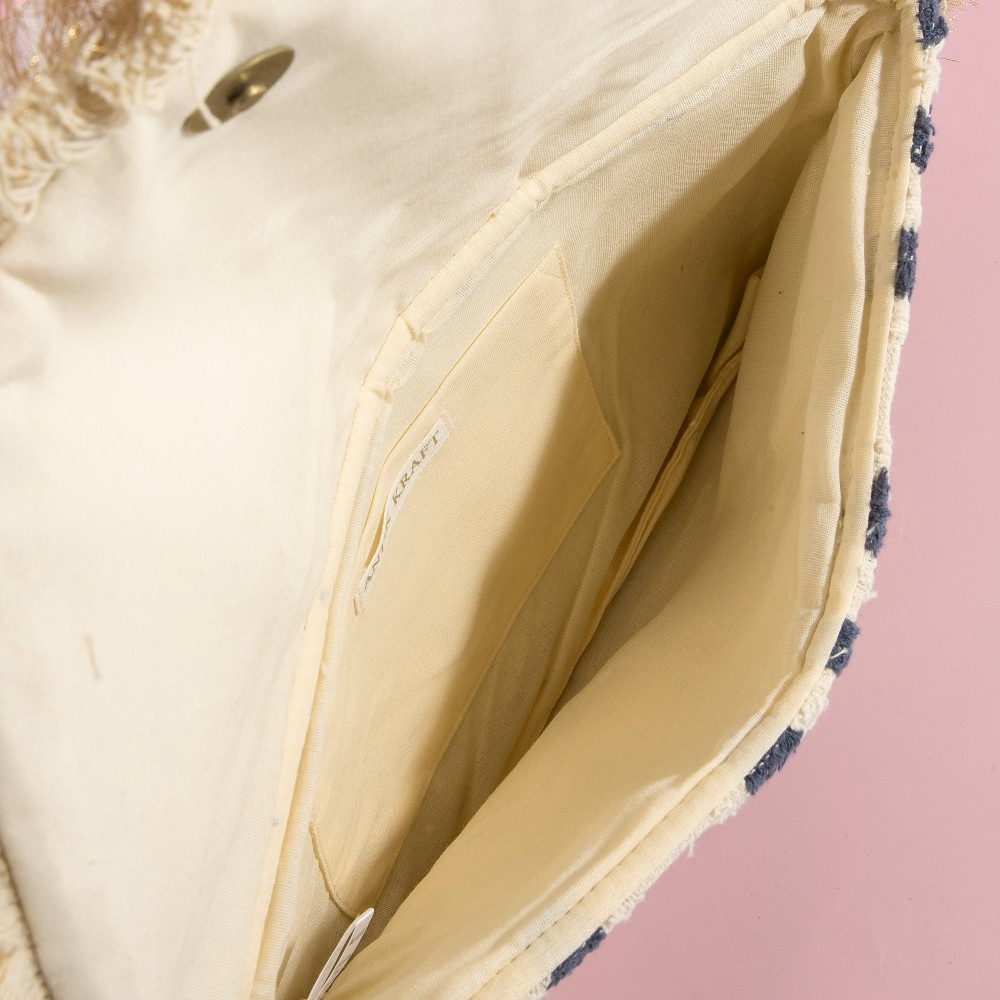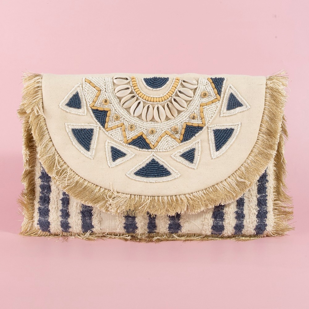 • Sleek, modern, and always stylish, this clutch bag shows off a distinctive beaded fringe trim mandala design. Transform your outfit from ordinary to extraordinary with the touch of elegance provided by this versatile clutch bag. Available in NAVY. This item is sold in packs of 1.