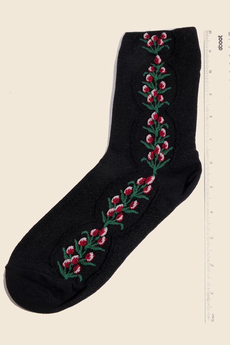 This pair of socks displays a fashionable black floral tulip vine embroidered style. Step into a world of refined taste as this pair of socks effortlessly refines the details of your outfit.