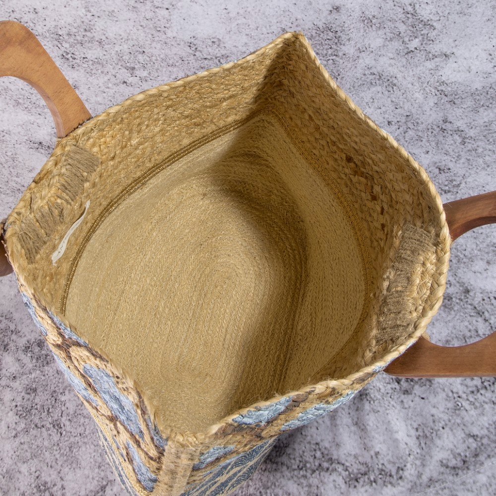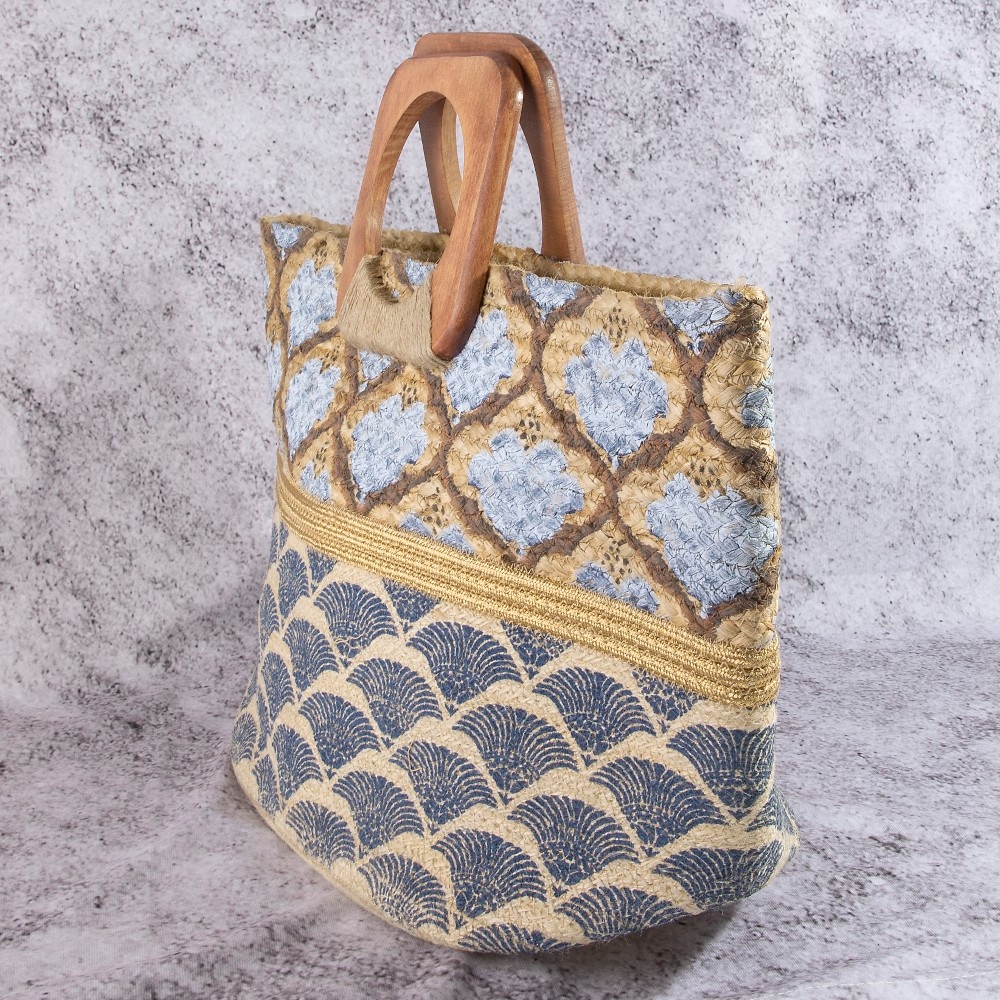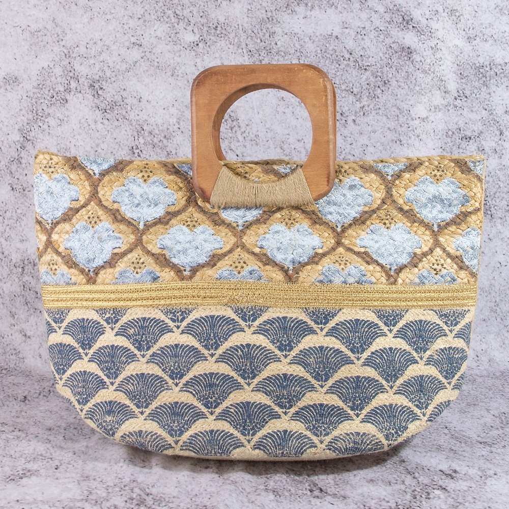 • A timeless piece that will never go out of style, this tote bag shows off a distinctive blue and gold print woven wooden handle design. A must-have tote bag that adds a unique flair to any look. Available in BLUE. This item is sold in packs of 1.