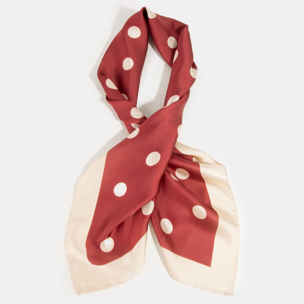 This piece is a true showstopper, this scarf features a distinct burgandy beige polka dot square design. Unleash the charm of this versatile scarf, effortlessly turning any outfit into a fashion statement. Available in BU. This item is sold in packs of 1.