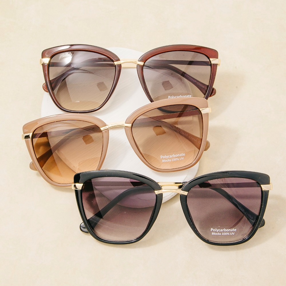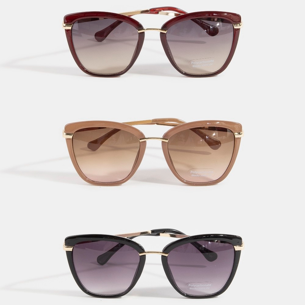 A must-have addition to any set of sunglasses collection, this set of sunglasses carries a charming cat-eye double bar bridge sunglasses design. A must-have set of sunglasses for anyone who loves to add some flair to their outfits. Available in ASSORTED. This item is sold in packs of 12.