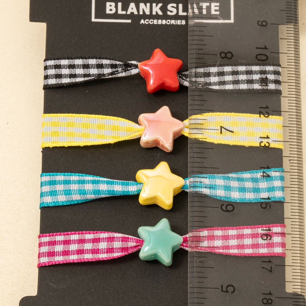 • A bold and daring choice, perfect for those who want to stand out from the crowd, this bracelet showcases a breathtaking ceramic star charm plaid ribbon design. Perfect for dressing up your favorite outfit, this bracelet is a must-have. This item is sold in packs of 1.
