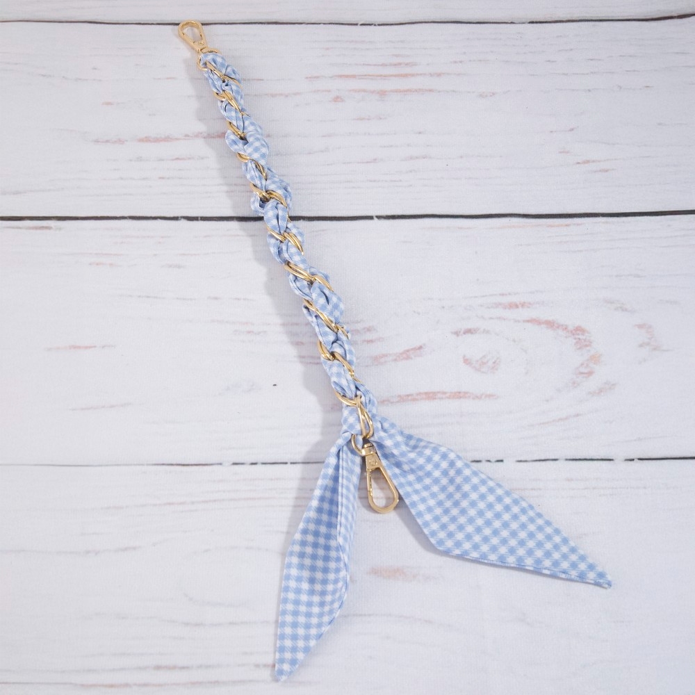 - This piece is both timeless and contemporary, this keychain carries a charming checkered scarf chain bag charm design. A must-have keychain for anyone who loves to add some flair to their outfits. Available in MBLG2, MRDG2. This item is sold in packs of 1.