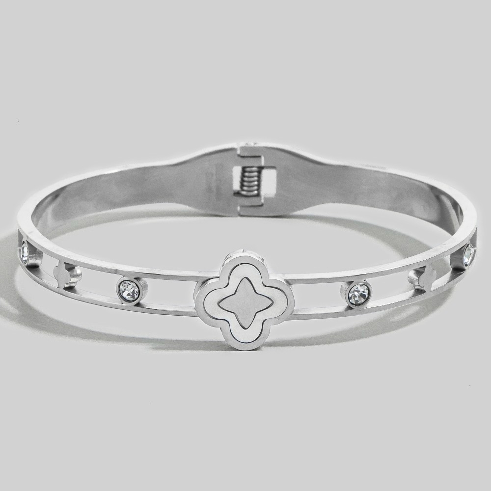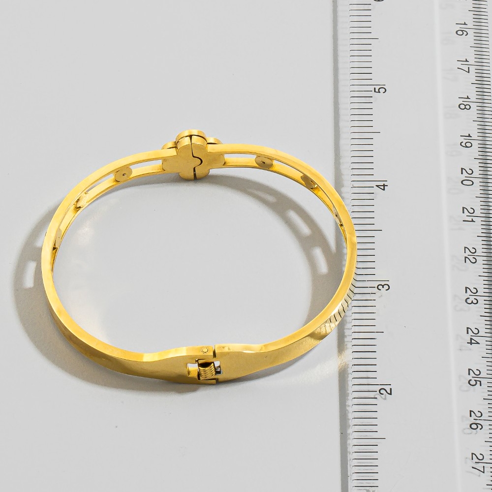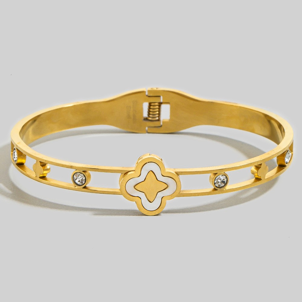 Perfect for any occasion, this bangle bracelet contains a special clover cubic zirconia mother of pearl design. Elevate your everyday style with this versatile bangle bracelet, a simple yet impactful addition to your fashion repertoire. Available in GMOP, SMOP. This item is sold in packs of 1.