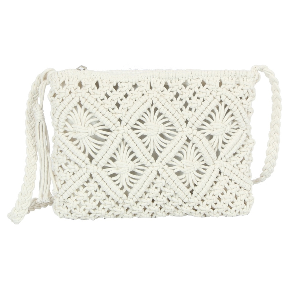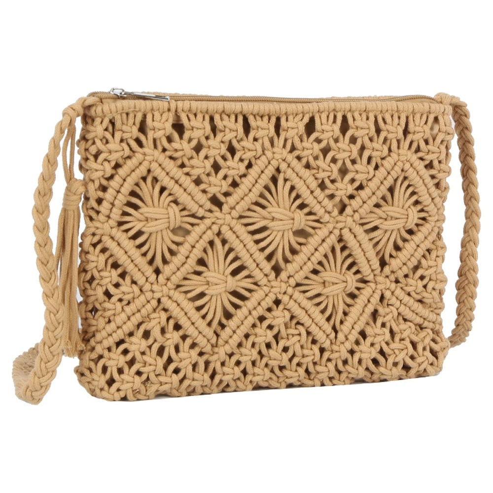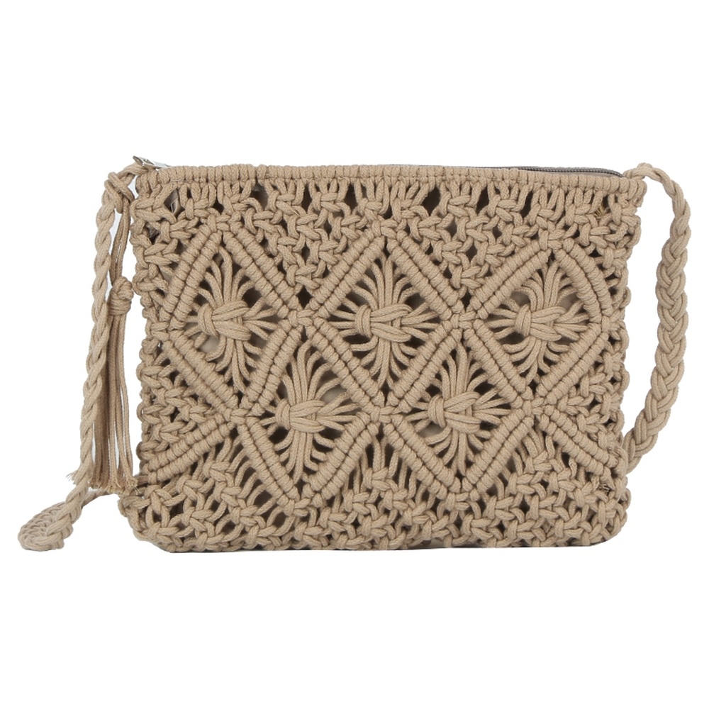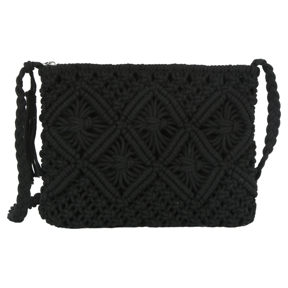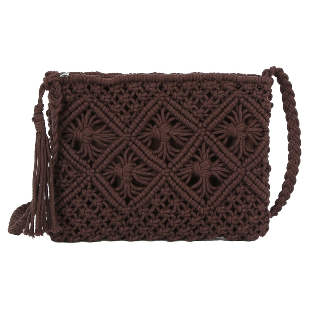 Perfect for any occasion, this crossbody bag exudes a refined crocheted woven macrame design. Elevate your personal style effortlessly with this versatile crossbody bag, an essential component for a refined wardrobe. Available in BG, BK, BR, BS, CF, OLV, OR, ST. This item is sold in packs of 1.