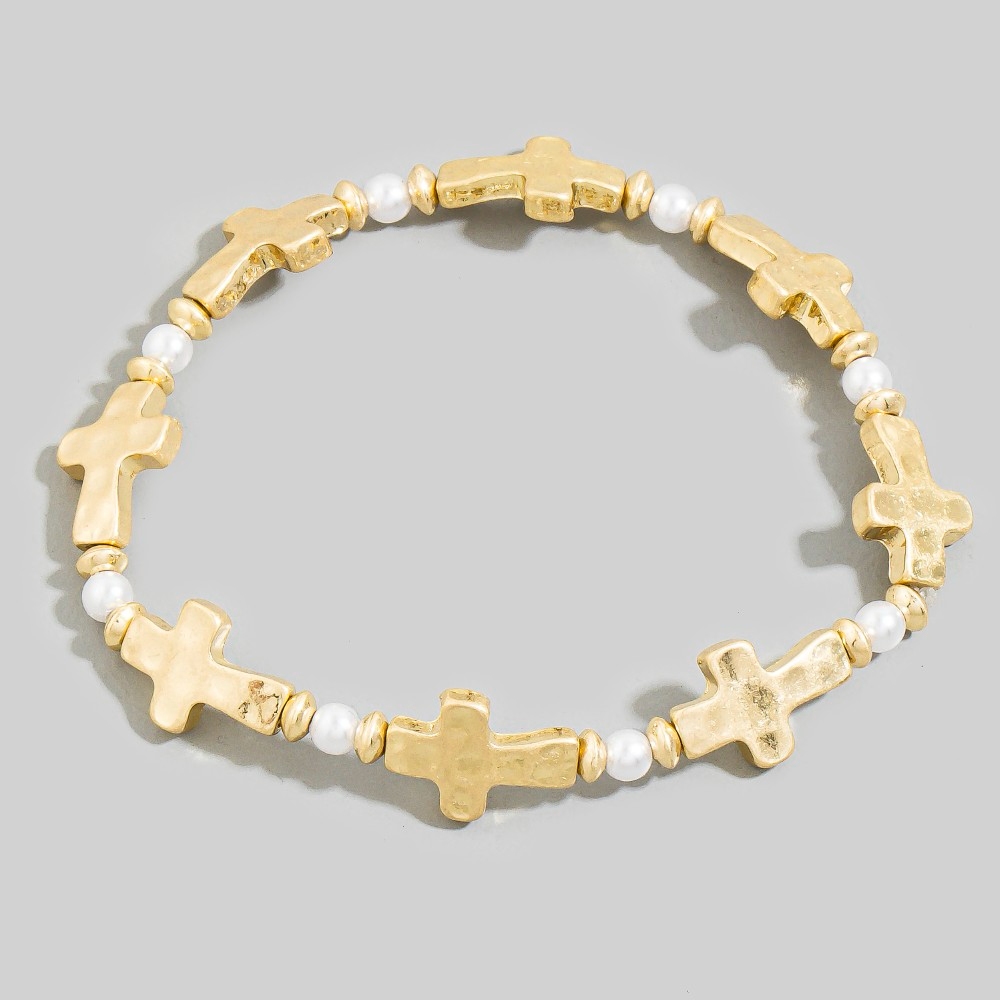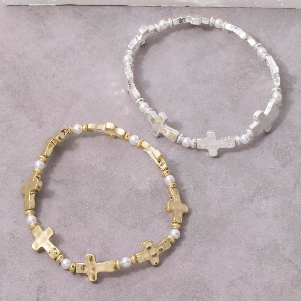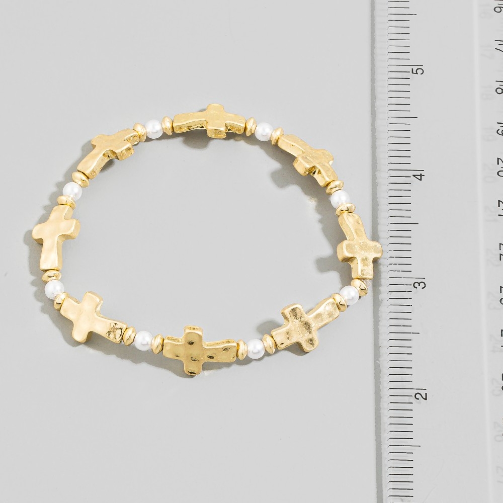 Effortlessly elevate your style, this stretch bracelet embodies a sophisticated cross & pearl beaded design. A perfect addition to your wardrobe that effortlessly enhances your style. Available in WG, WS. This item is sold in packs of 1.