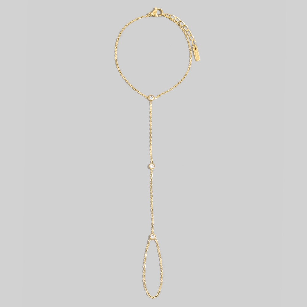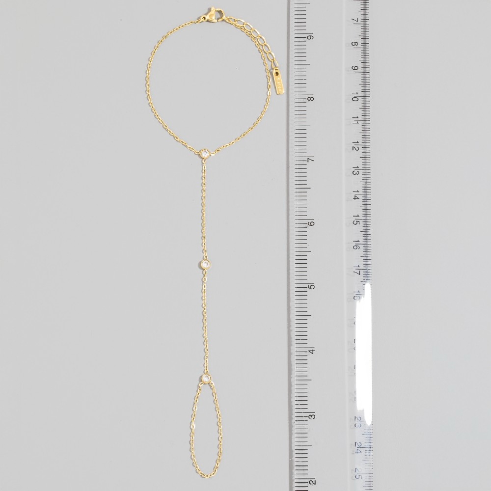 • Bold, daring, and endlessly stylish, this bracelet showcases an alluring cz bezel station hand chain finger ring design. Add some personality to your outfit with this stylish bracelet. Available in GD, RH. This item is sold in packs of 1.