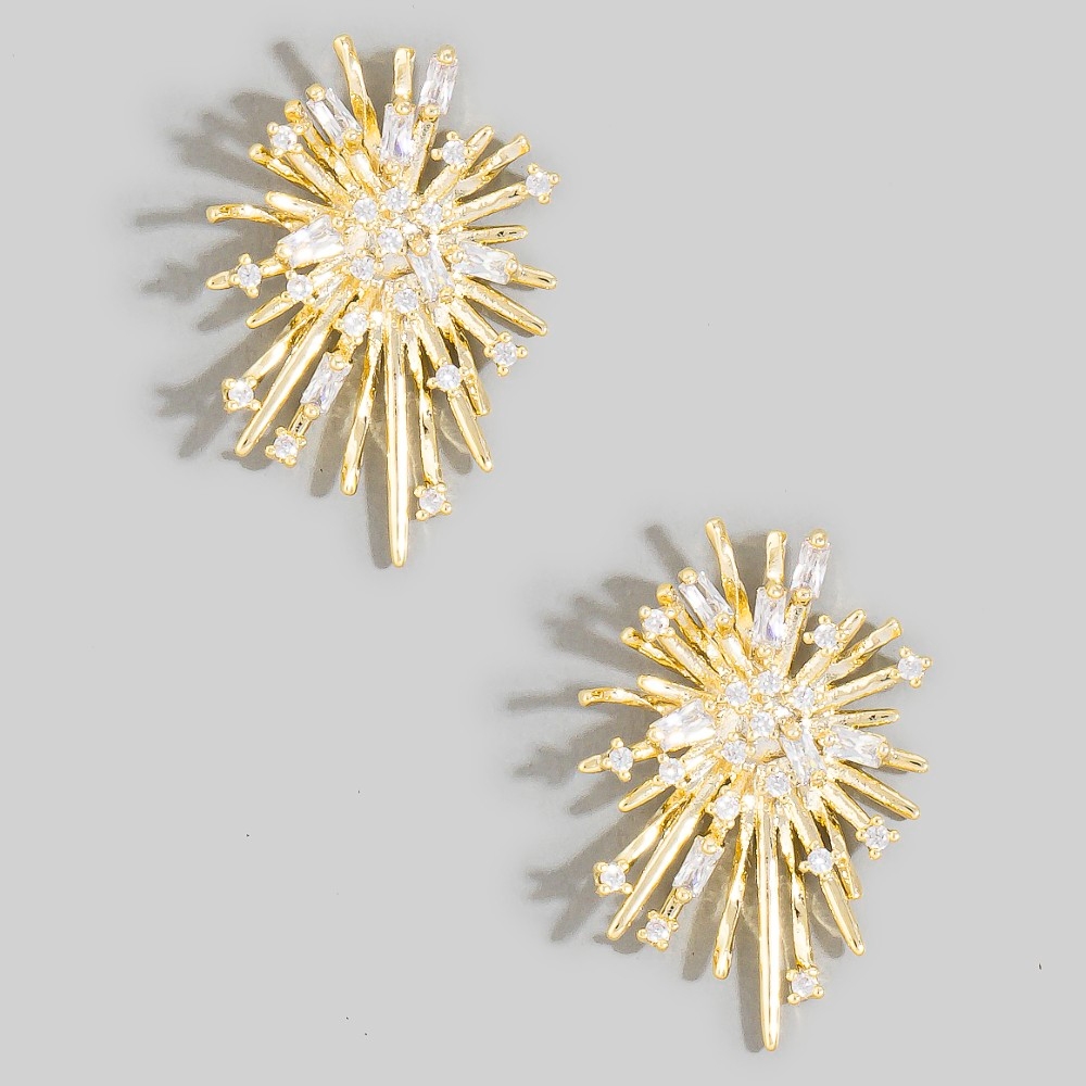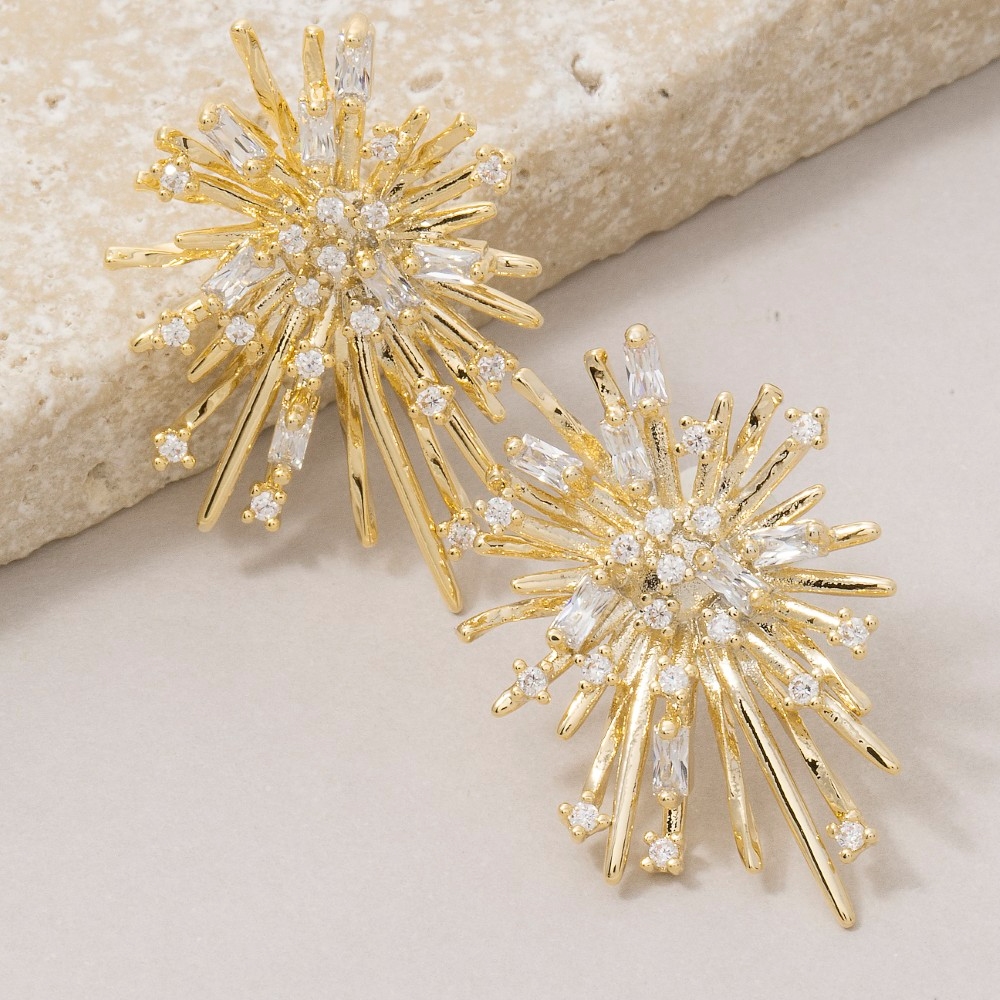• The epitome of sophistication and style, this pair of stud earrings incorporates a flawless cz cluster studded starburst design. This pair of stud earrings is a great way to add some flair to your outfit without going over the top. Available in G. This item is sold in packs of 1.