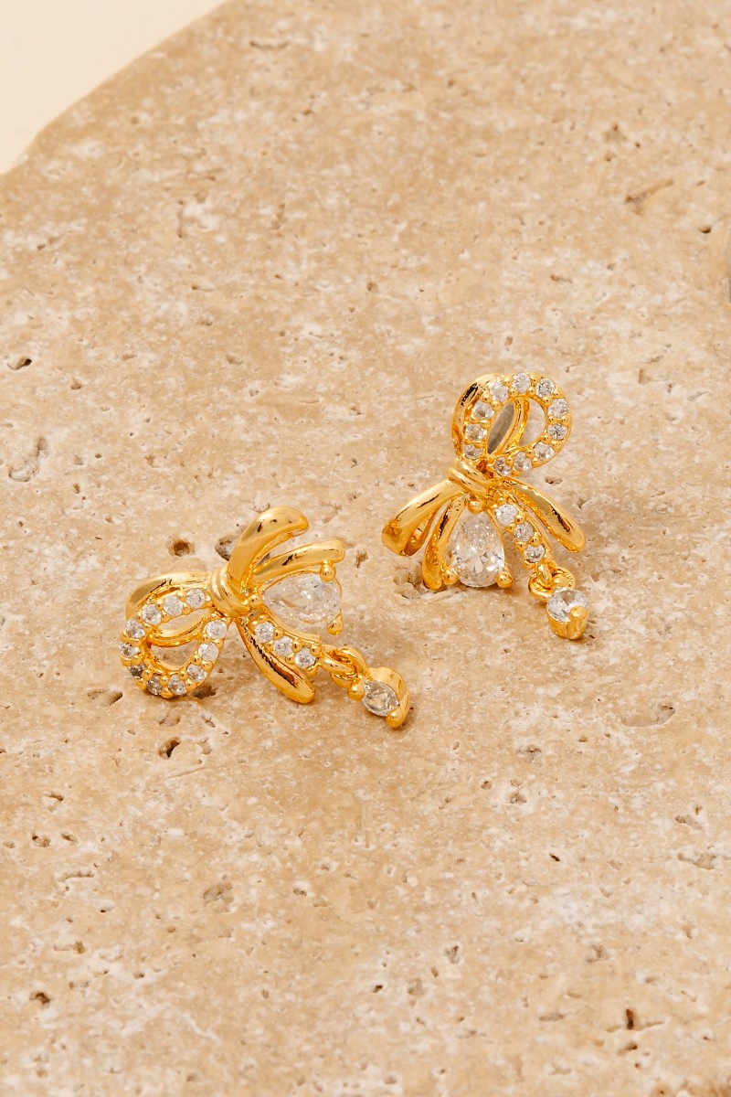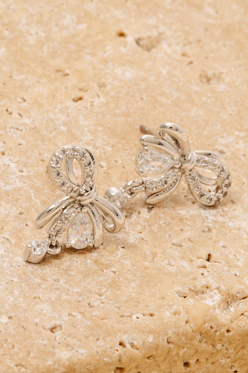 • This pair of stud earrings displays a fashionable cz ribbon bow and charm style. Delight in the intricate details that make this pair of stud earrings an essential element in expressing your fashion identity.
