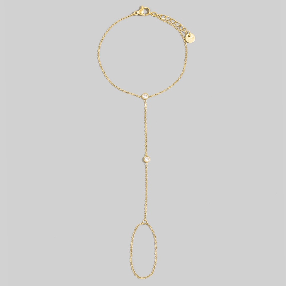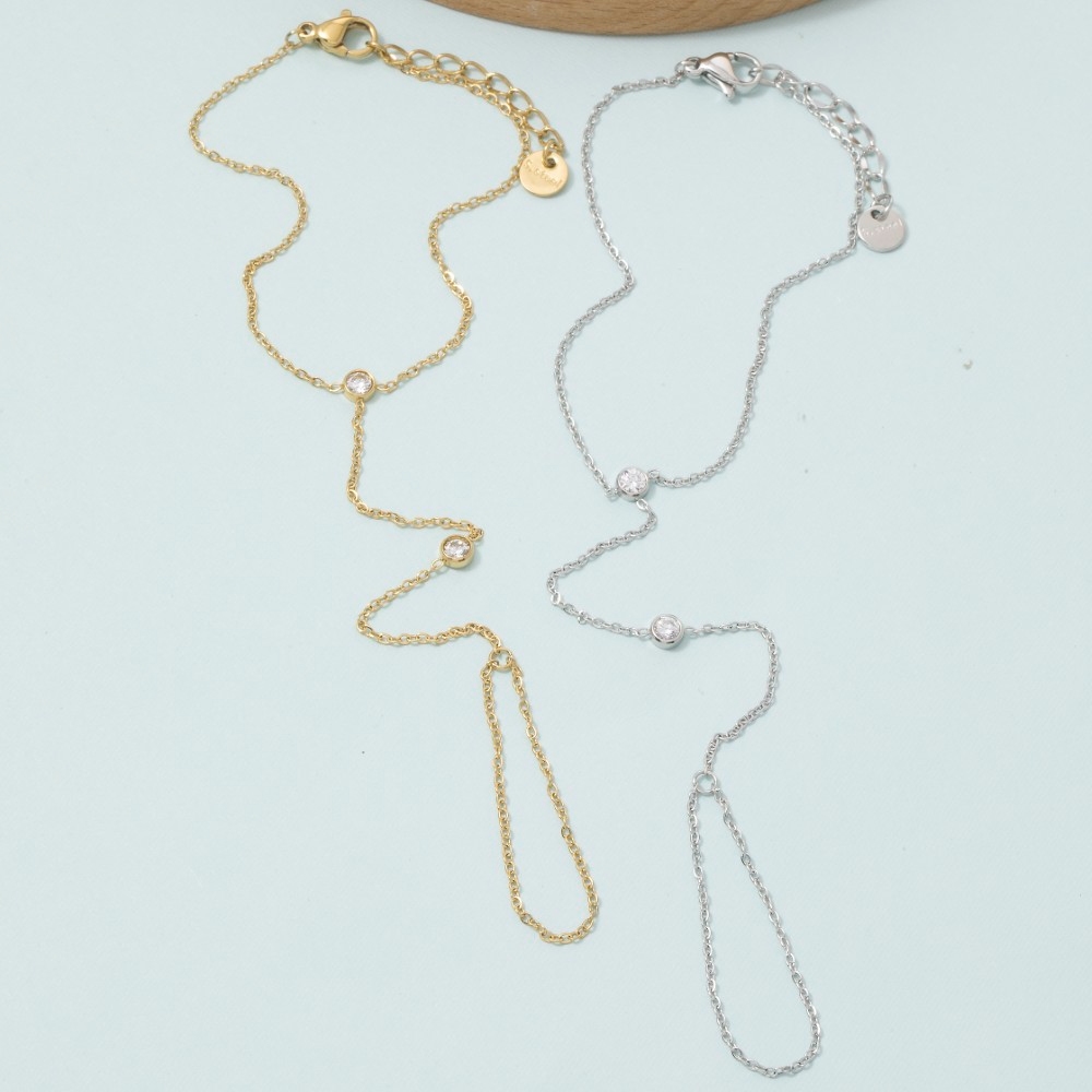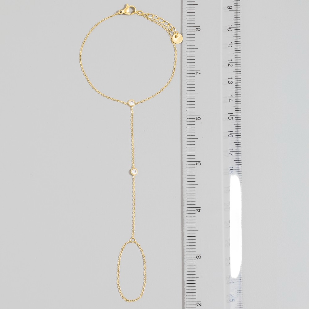 - Effortlessly chic and sophisticated, this bracelet radiates a sleek dainty cubic zirconia bezel hand chain finger ring design. This bracelet is a great way to add some flair to your outfit without going over the top. Available in GD, RH. This item is sold in packs of 1.