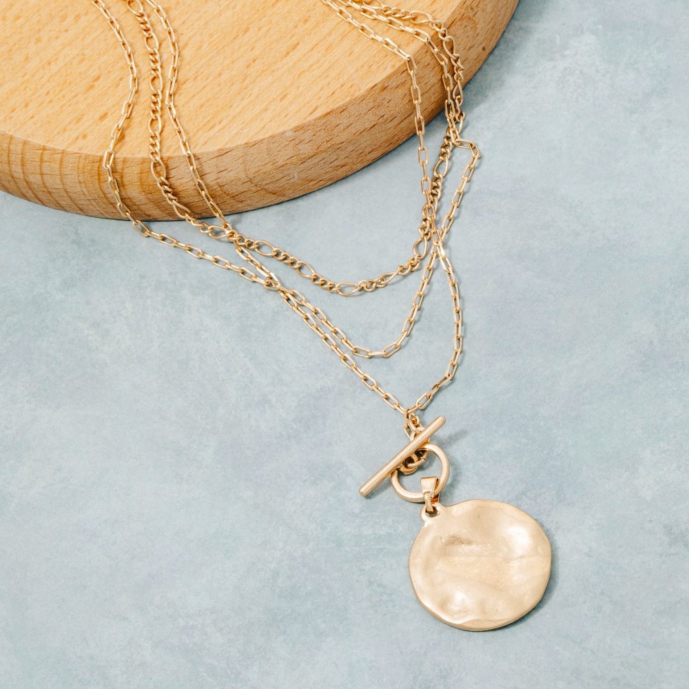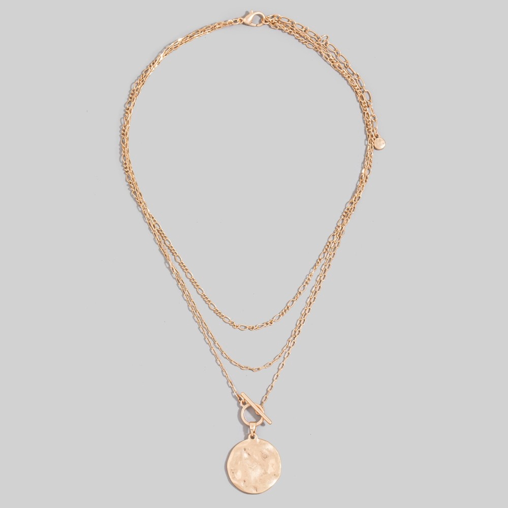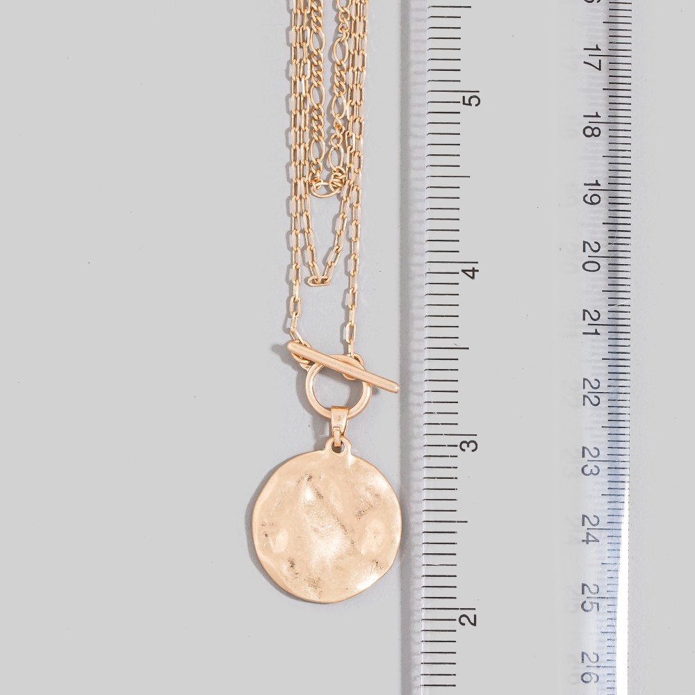 • A classic design with a contemporary twist, this pendant necklace radiates a sleek dainty layered chian hammered disc design. Make a lasting impression with this versatile pendant necklace, a subtle yet impactful addition to your fashion repertoire. Available in WG. This item is sold in packs of 1.