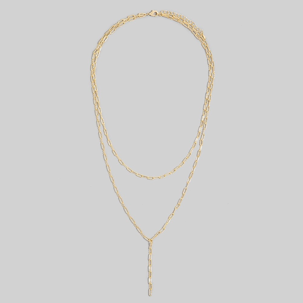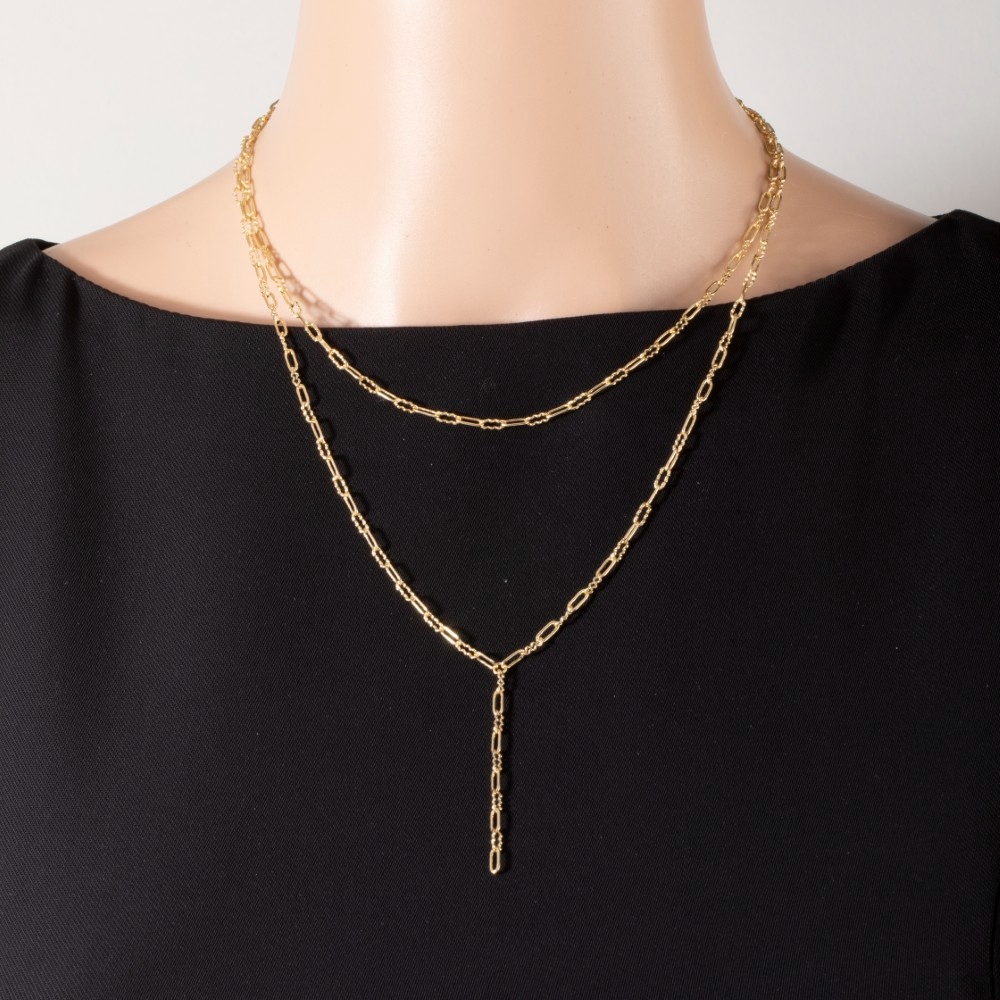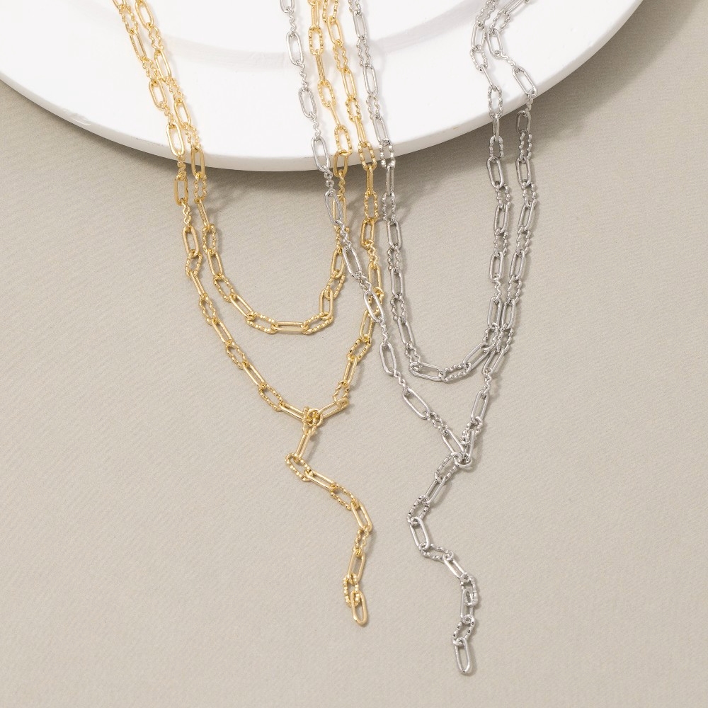 - Sleek, modern, and always stylish, this necklace carries a charming double layer paperclip chain lariat design. Infuse a hint of luxury into your daily attire with this versatile necklace, a must-have for those who appreciate timeless elegance. This item is sold in packs of 12.