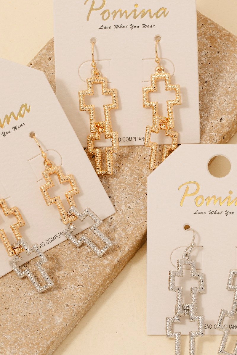 - The perfect way to showcase your unique style, this pair of earrings comes with a special double textured cross dangle hook design. Unlock endless styling possibilities with this versatile pair of earrings, creating a signature look that speaks volumes. Available in GD, GDRH, RH. This item is sold in packs of 1.