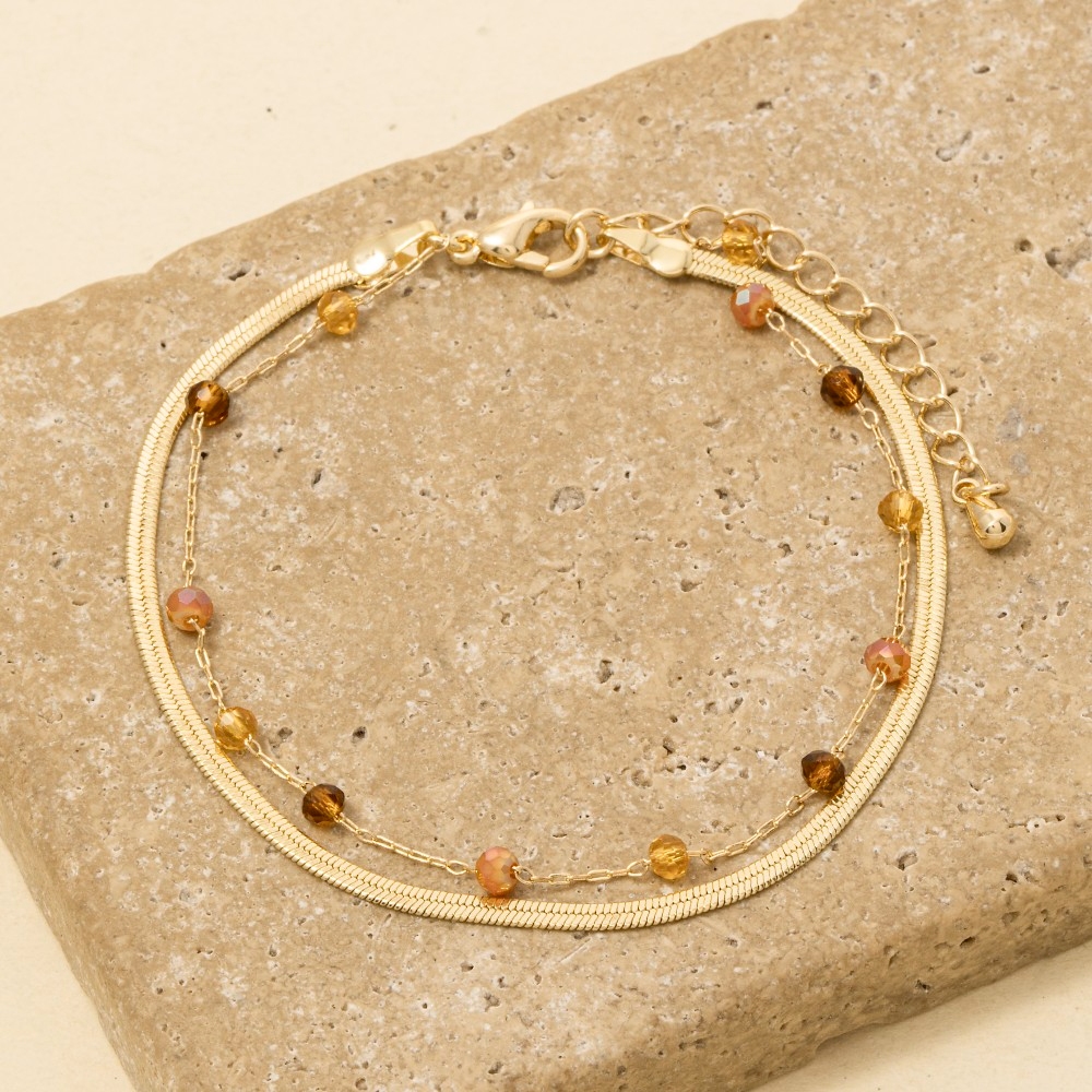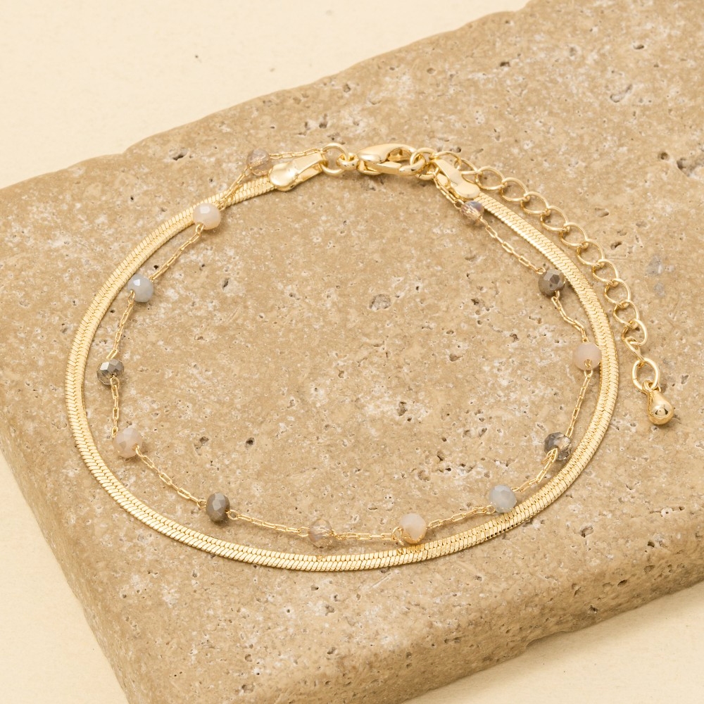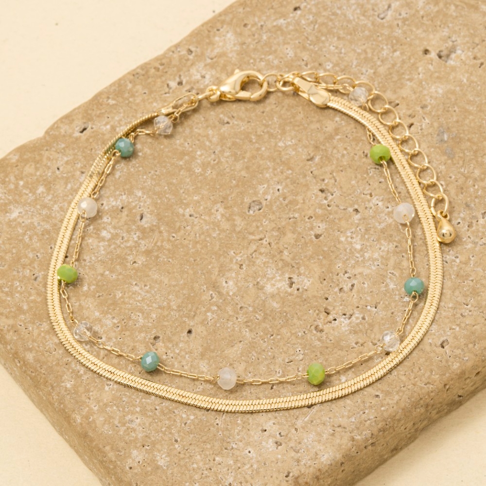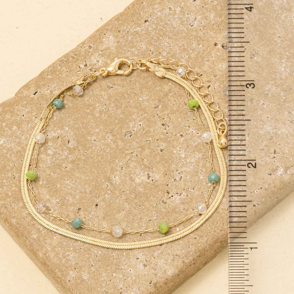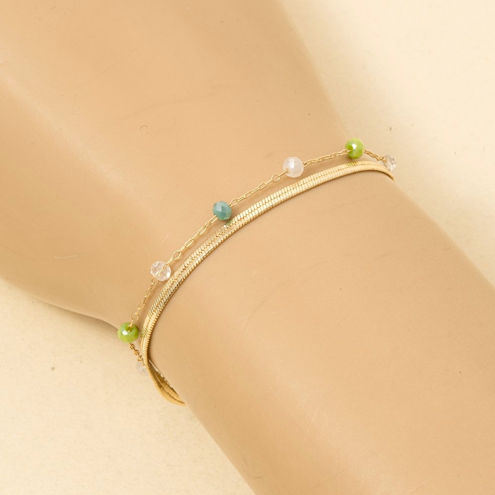 - The epitome of sophistication and style, this bracelet adds a distinctive faceted glass beads and snake chain layered design. Perfect for dressing up or down, this versatile bracelet adds a touch of sophistication to any look. Available in GDMGY, GDMNT, GDTPZ. This item is sold in packs of 1.