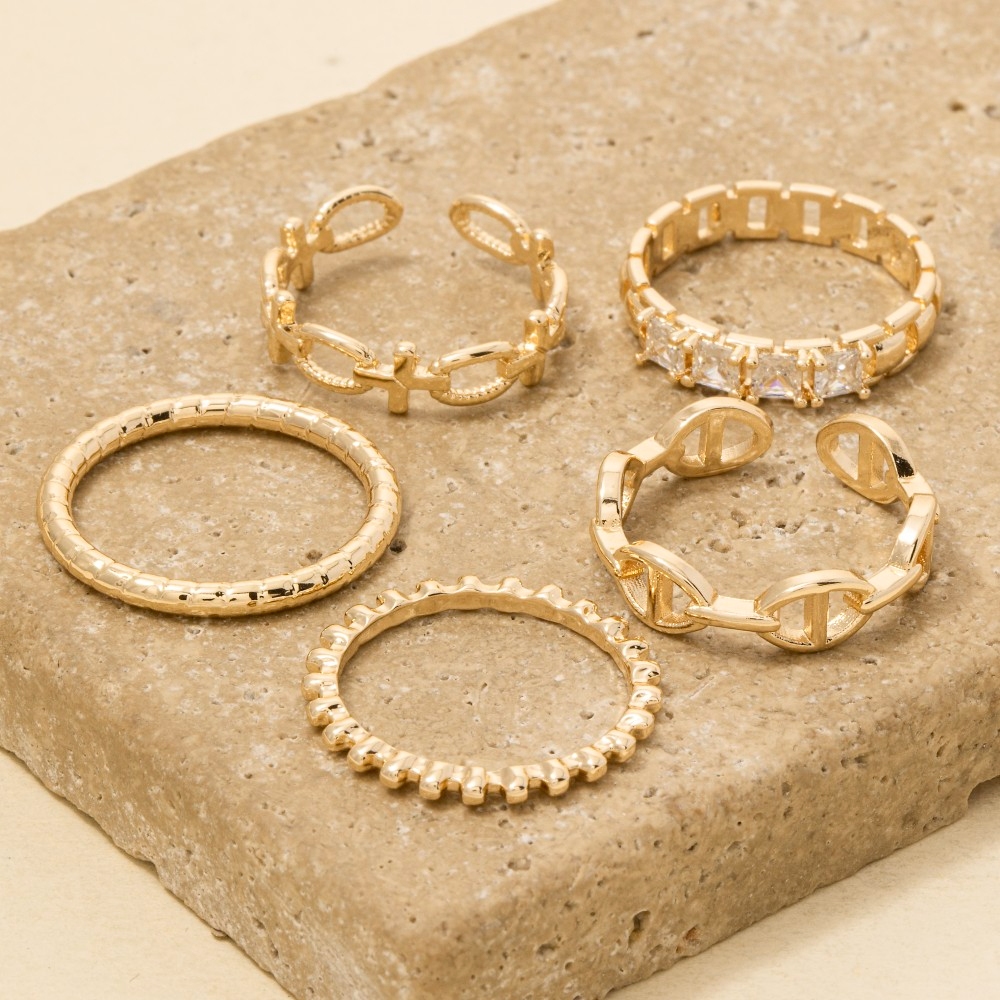 • An instant wardrobe staple, this ring set highlights a special five piece assorted rings set design. Elevate your fashion IQ with this versatile ring set, designed to seamlessly integrate into any style profile. Available in GCL. This item is sold in packs of 1.