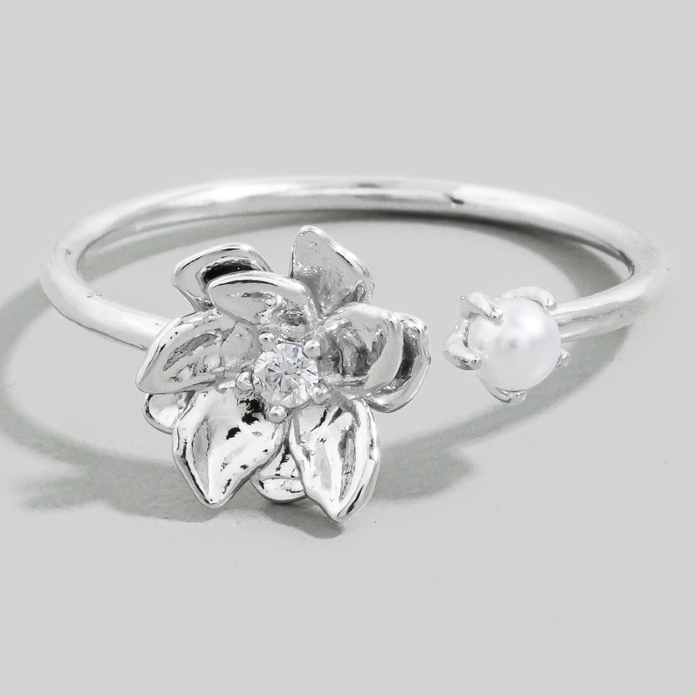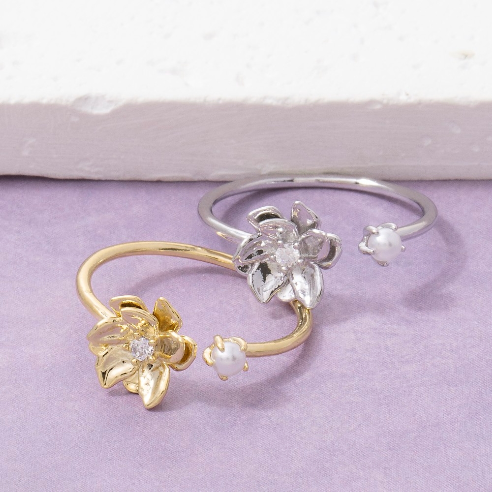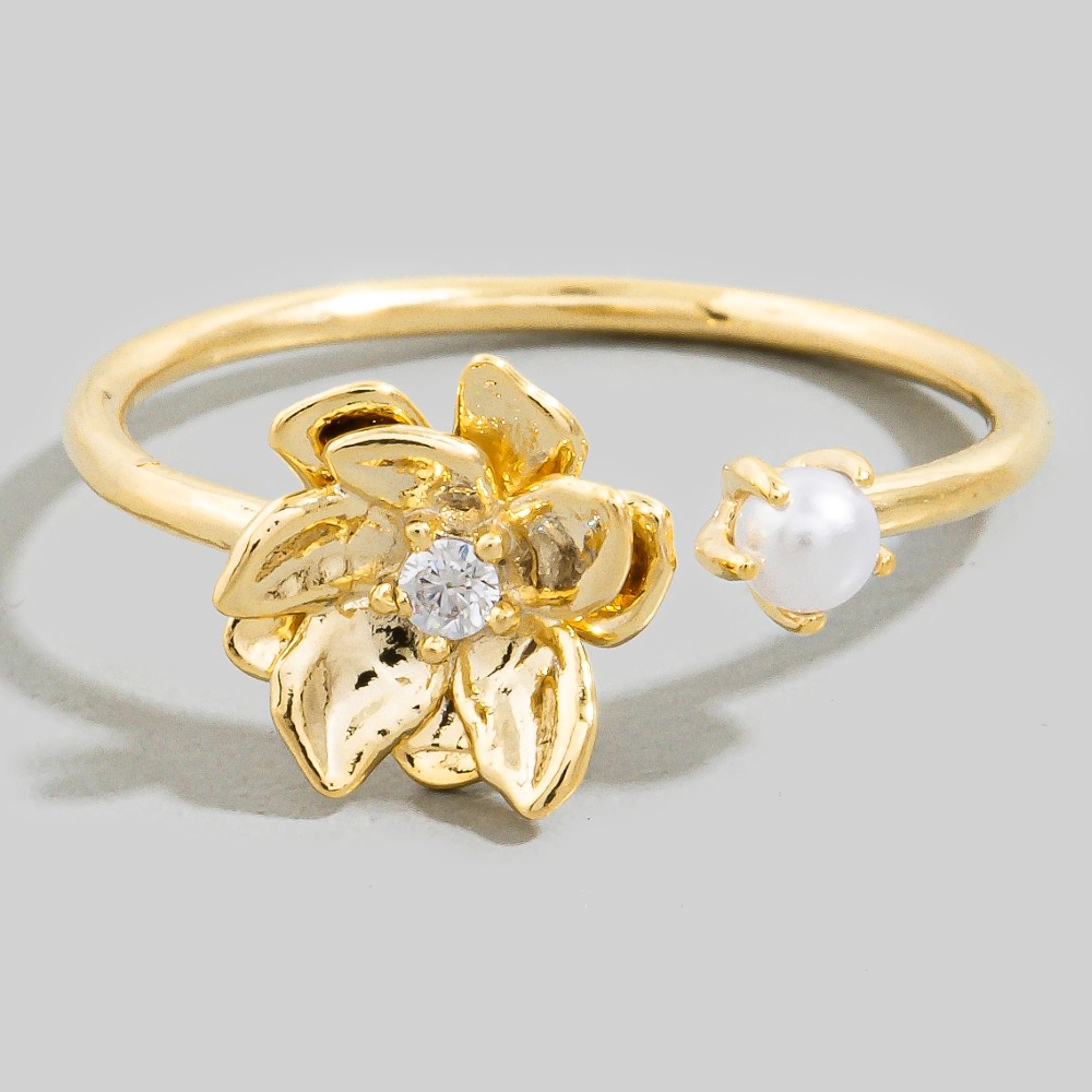 Sleek and modern, this ring showcases an alluring flower cubic zirconia & pearl open cuff design. Elevate your style effortlessly with this versatile ring, enhancing the appeal of any ensemble. Available in GDCRM, RHCRM. This item is sold in packs of 1.