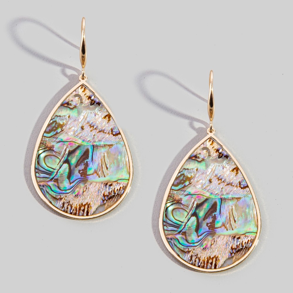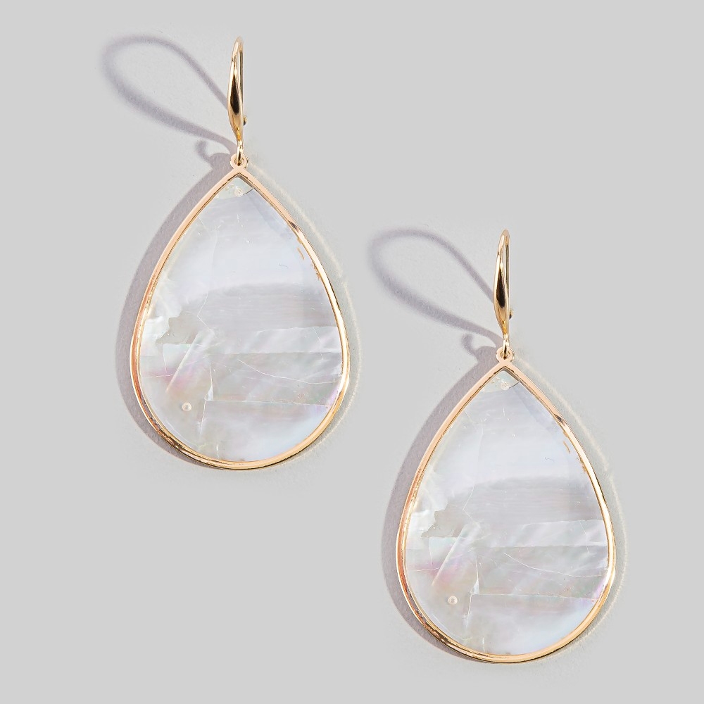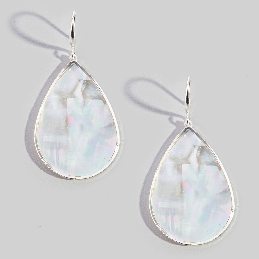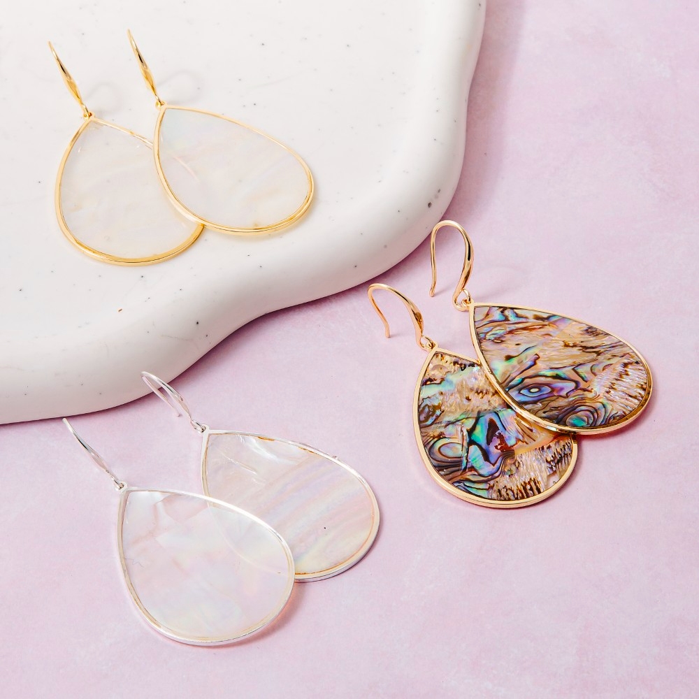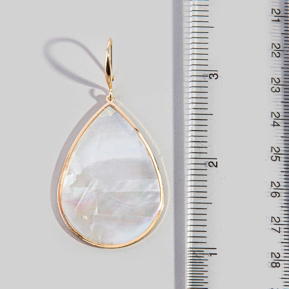 This pair of dangle earrings is made with 90% Mother Of Pearl and 10% Metal.