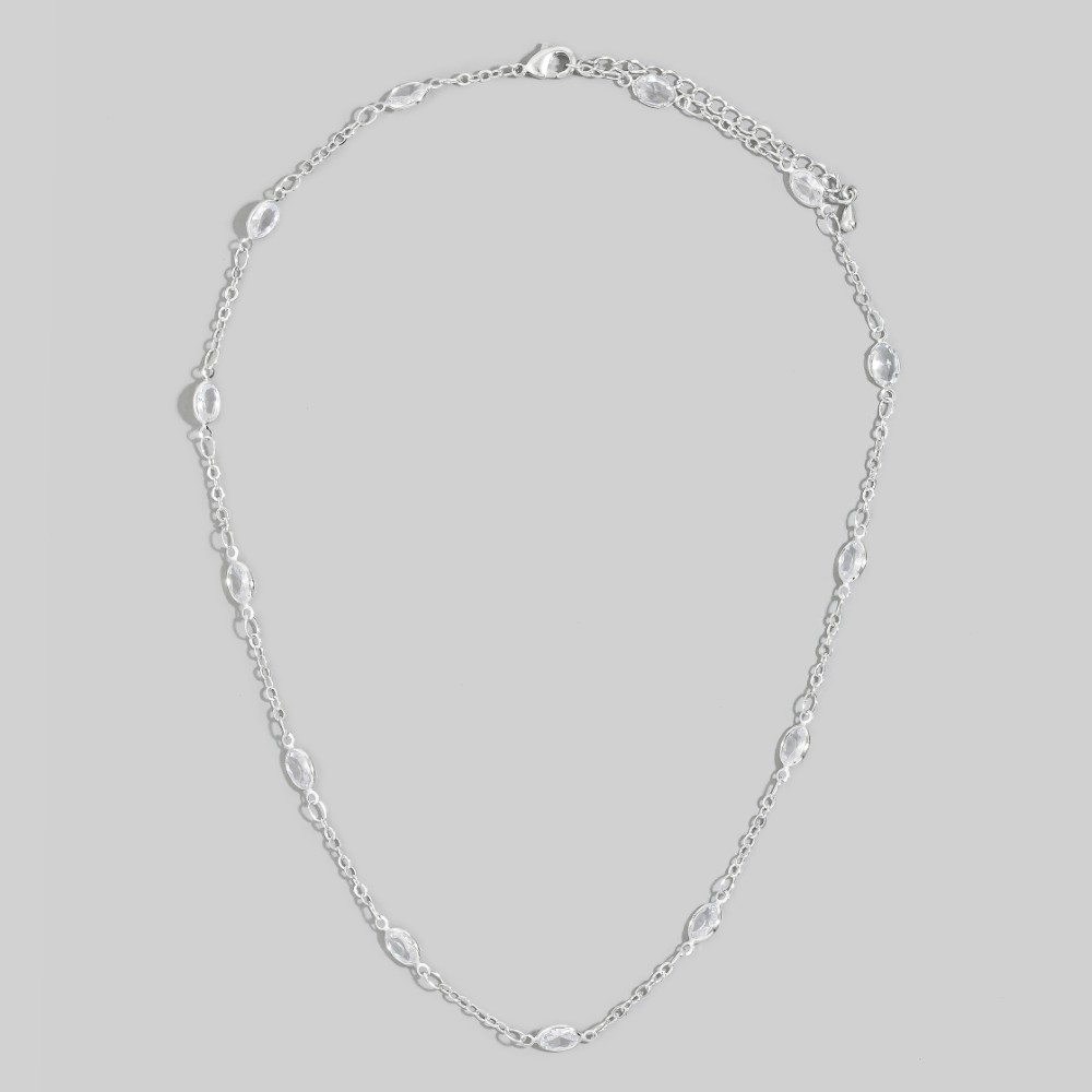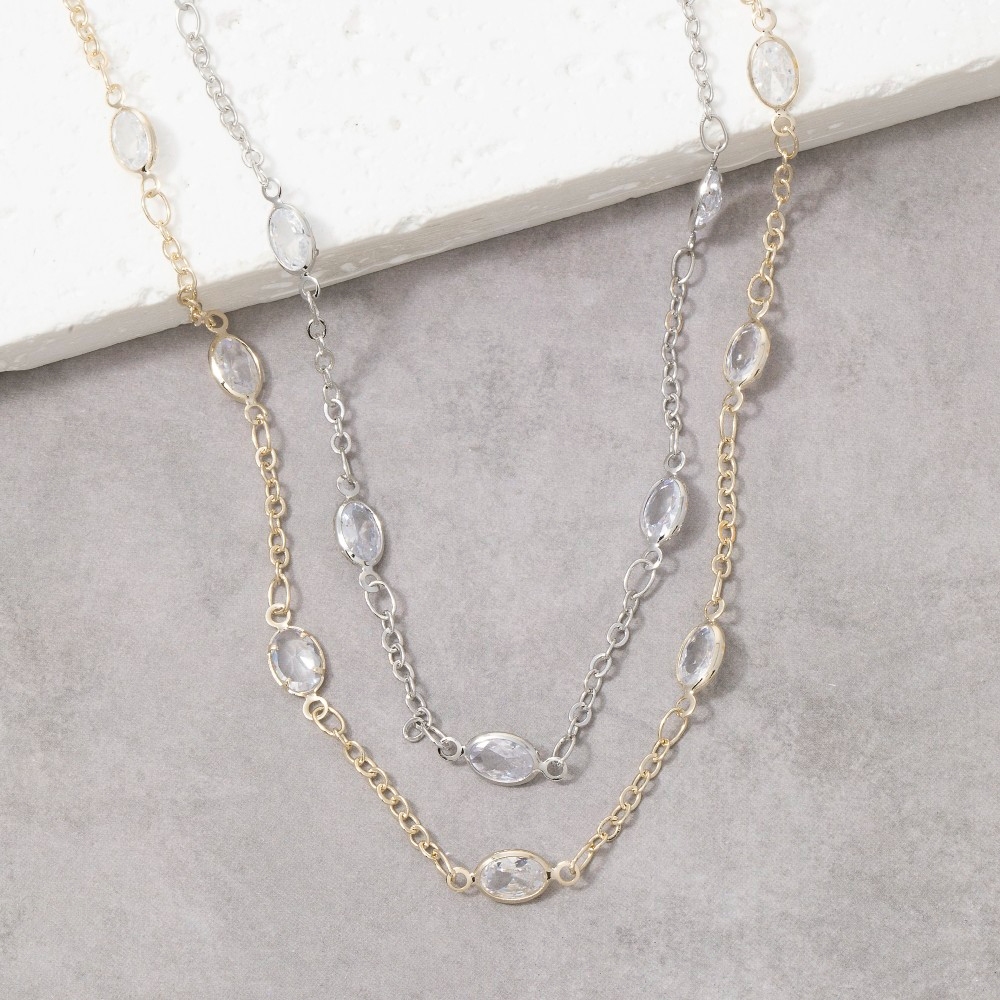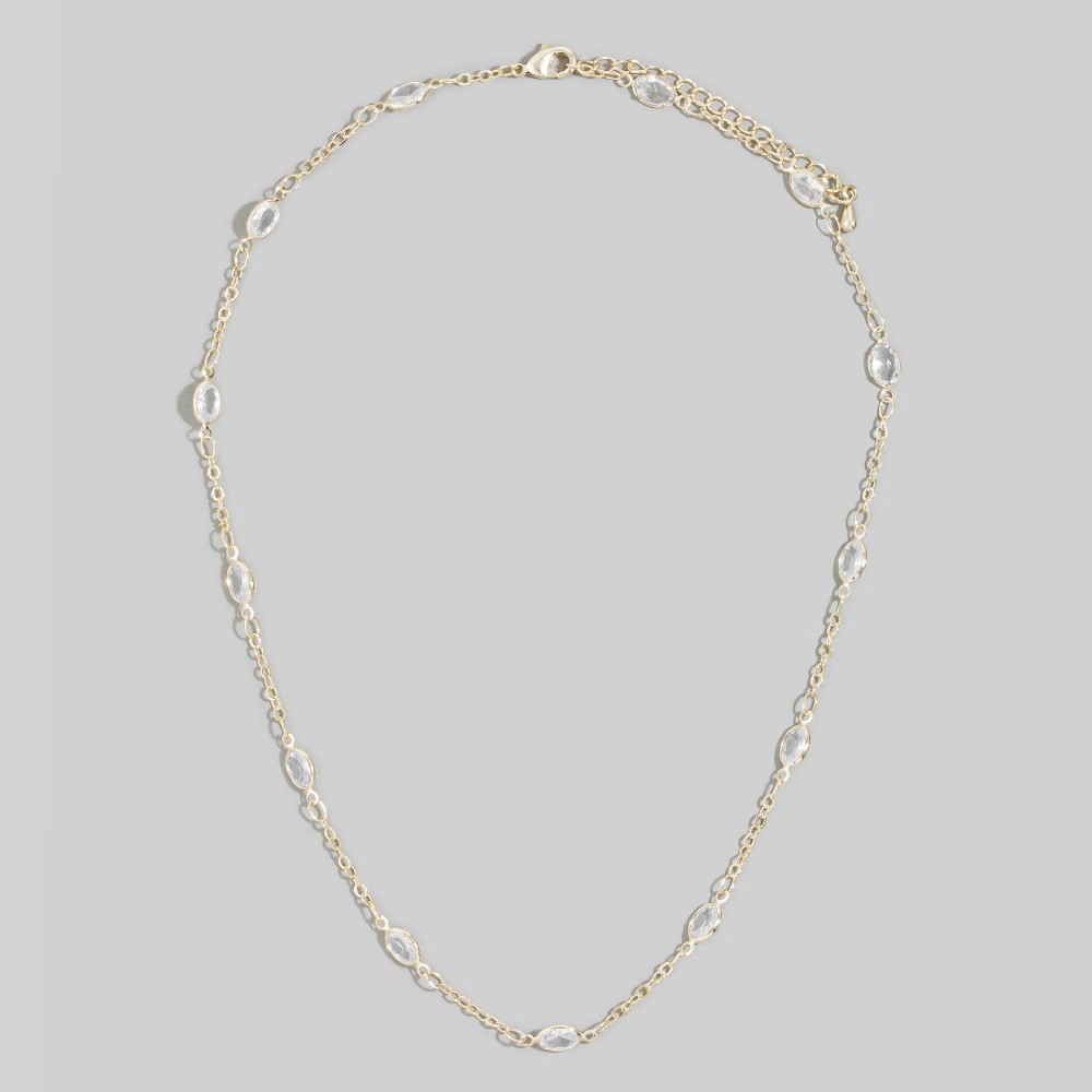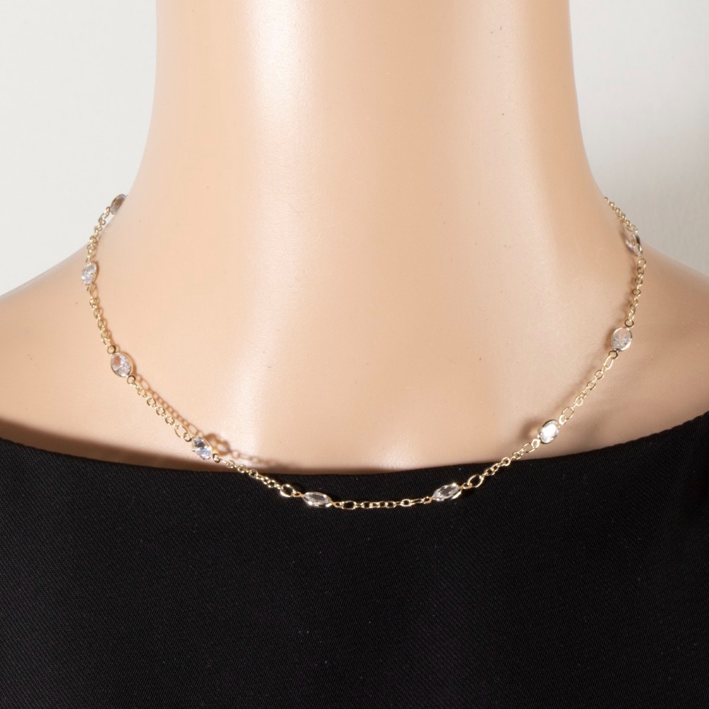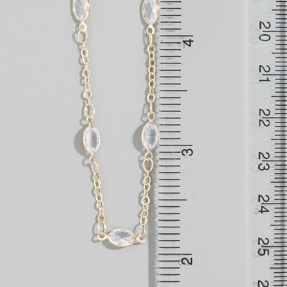 This piece is both timeless and contemporary, this necklace reveals an intricate gold chain oval cubic zirconia bezel station design. Perfect for any occasion, this versatile necklace will enhance any outfit you wear. Available in G, S. This item is sold in packs of 1.