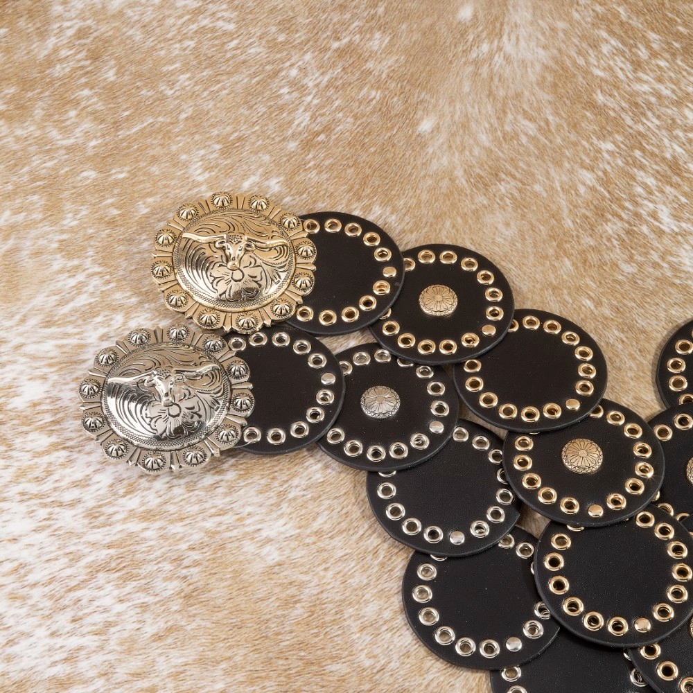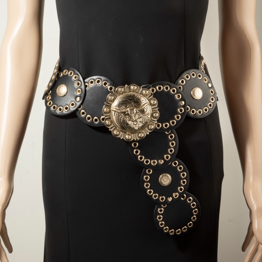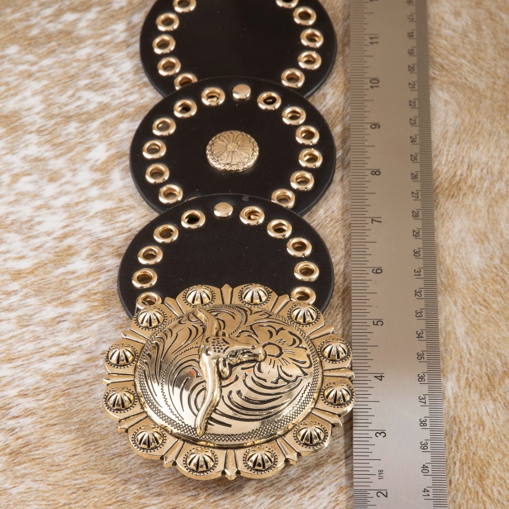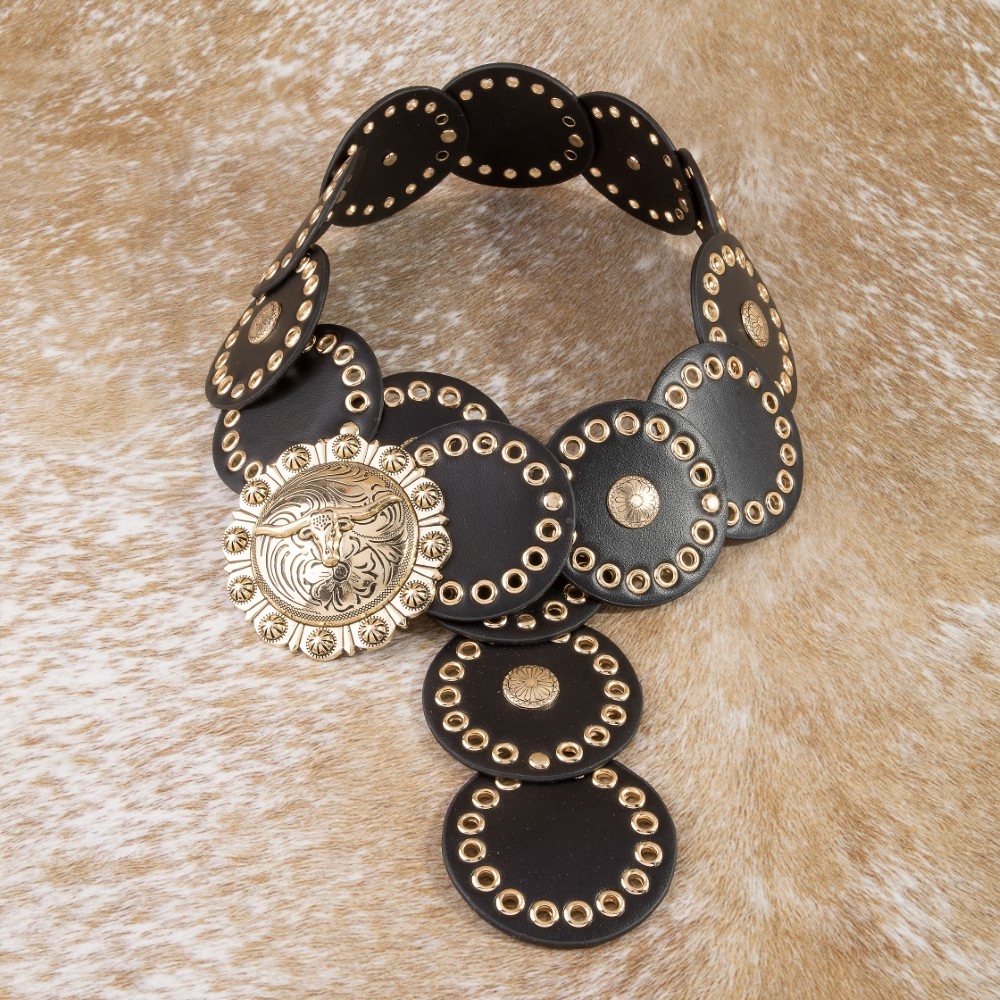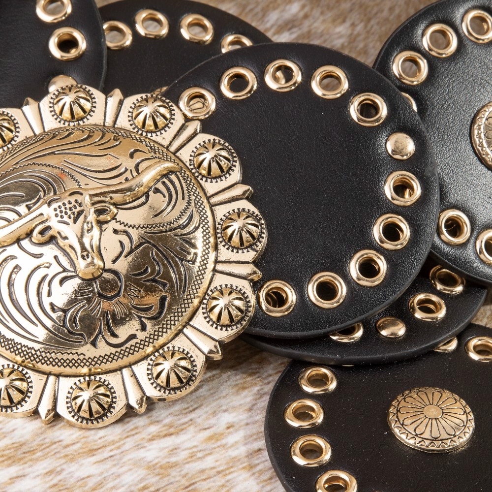 Perfectly versatile and endlessly stylish, this belt offers a remarkable gold circle grommet concho wide design. Elevate your fashion IQ with this versatile belt, designed to seamlessly integrate into any style profile. Available in BG, BS. This item is sold in packs of 1.