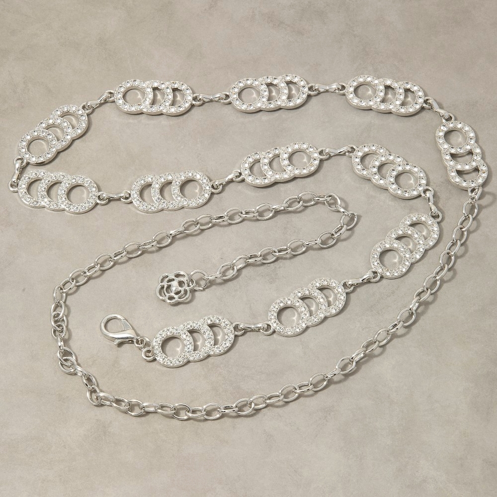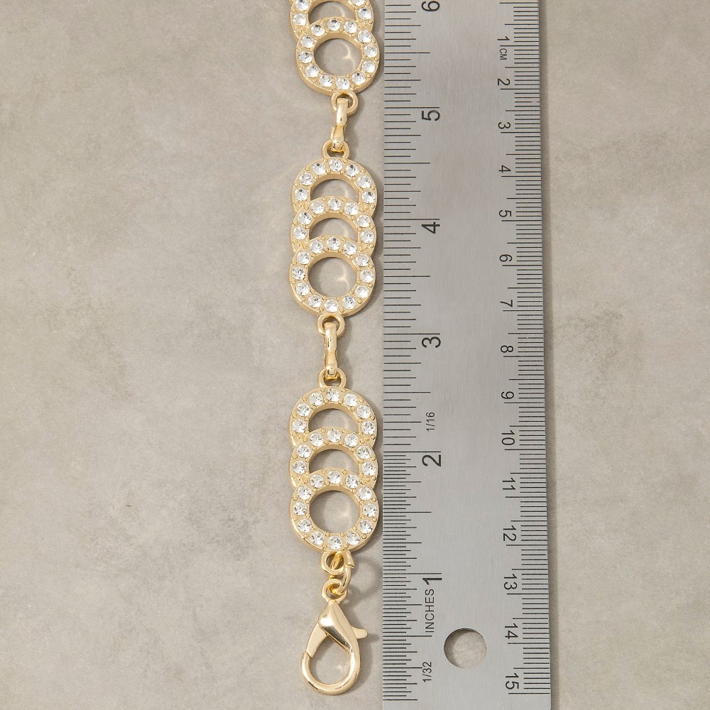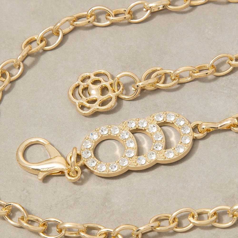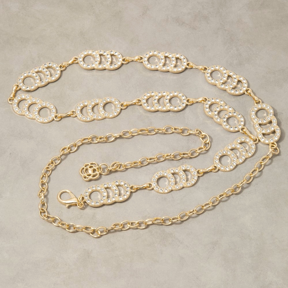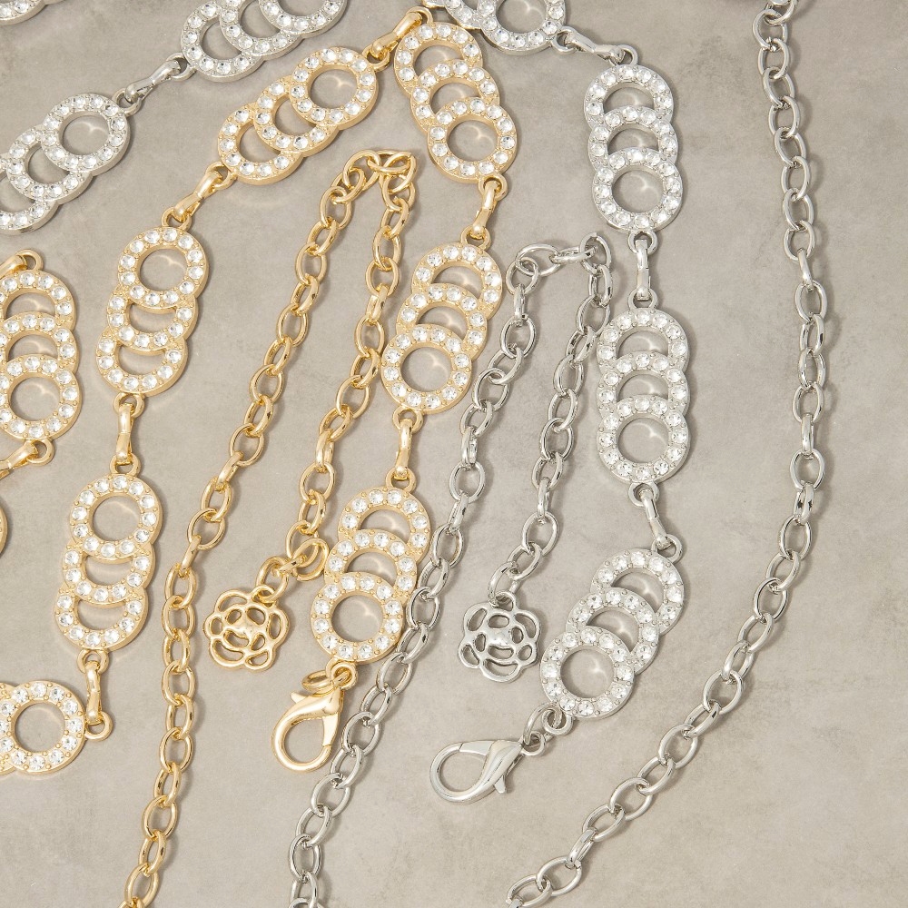 This piece is perfect for those who want to showcase their unique style, this chain belt adds a distinctive gold cubic zirconia open circle double link design. The perfect way to elevate any outfit, this chain belt adds a touch of elegance and style. Available in G, S. This item is sold in packs of 1.